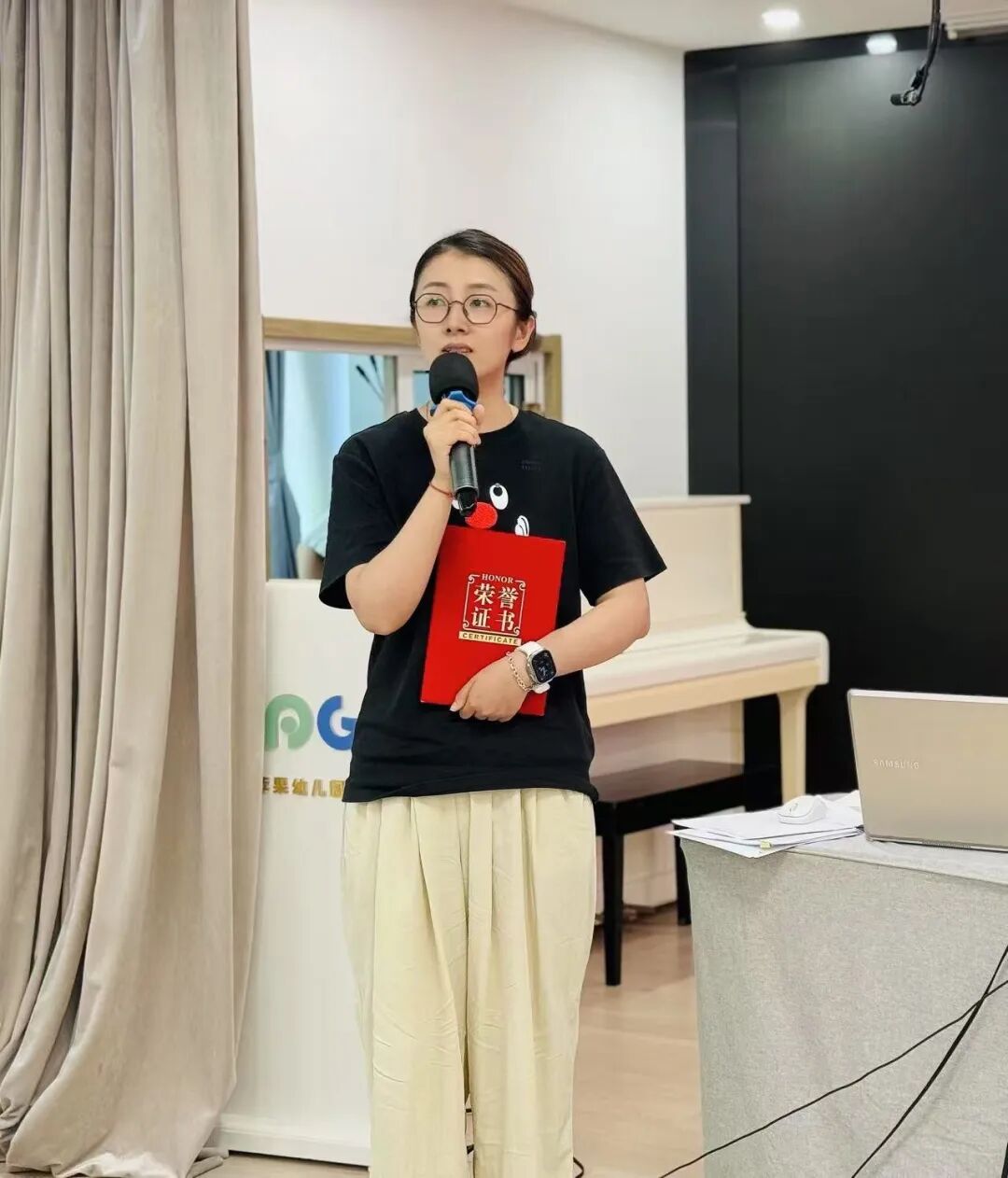 黄海音将荣誉归功于团队:“领导的信任如灯塔,同事的协作让我成长。这份荣誉属于每一个帮助过我的人,未来我会带着感恩为园所贡献力量。”