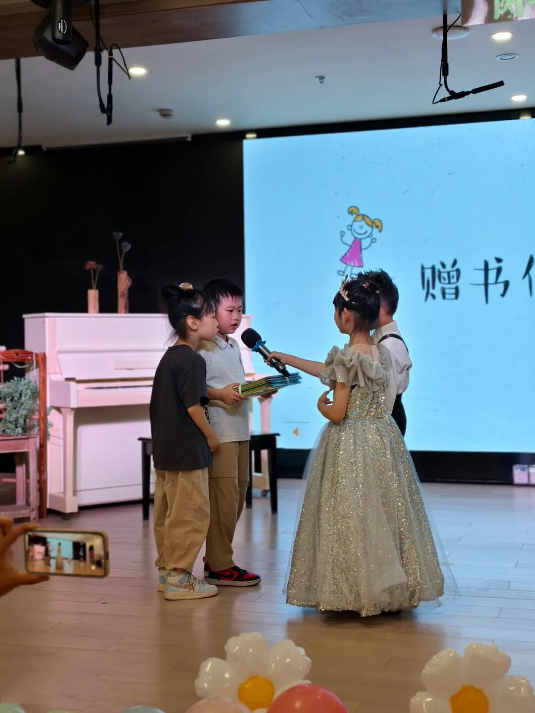 今年的毕业典礼上,大班萌娃还为弟弟妹妹增设了一个“赠书环节”,他们将珍藏绘本郑重地递给中班弟弟妹妹,折角书页,藏着阅读时光的独家记忆。传递的是对阅读的热爱,是希望弟弟妹妹能在书香中收获快乐与成长。而台下的班级一角,班级里精心打造的赠书角已悄然落成,等待着承载更多故事。