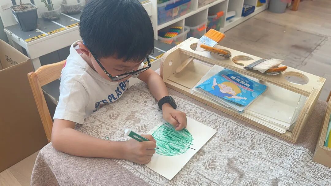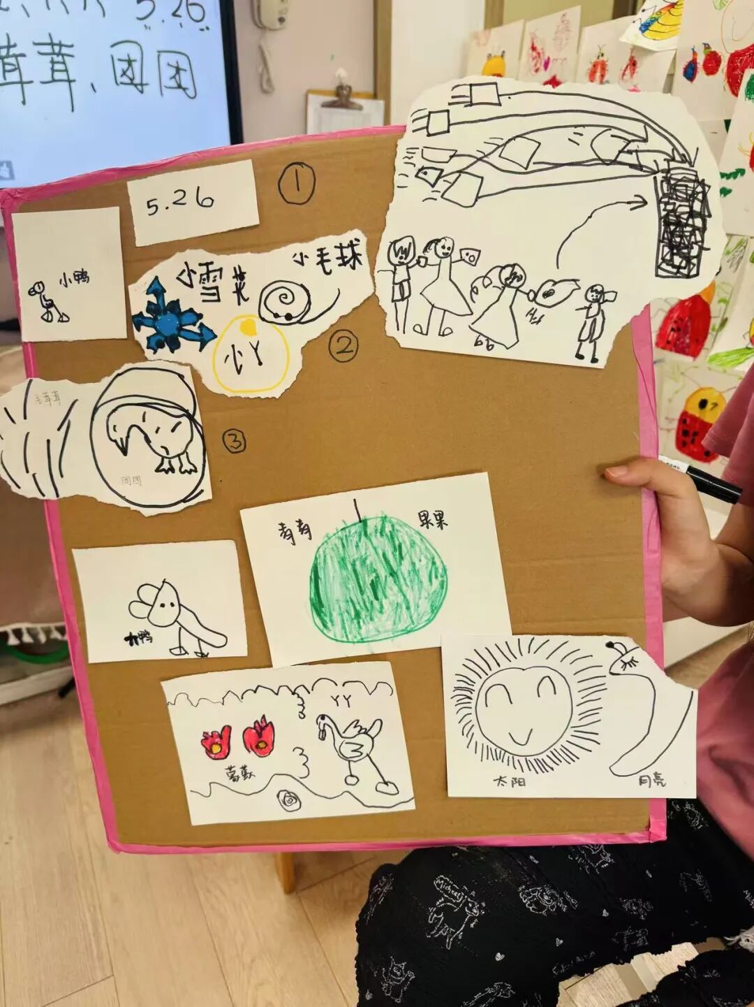 “青青” 和 “果果”,取自幼儿园的名字,孩子们就画下了结满果实的青苹果果树,旁边站着毛茸茸的两只小鸭子;“太阳” 和 “月亮”,寄托着希望大鸭鸭像日月一样常伴身边的愿望,于是灿烂的太阳、弯弯的月亮和可爱的鸭鸭一同跃然纸上。