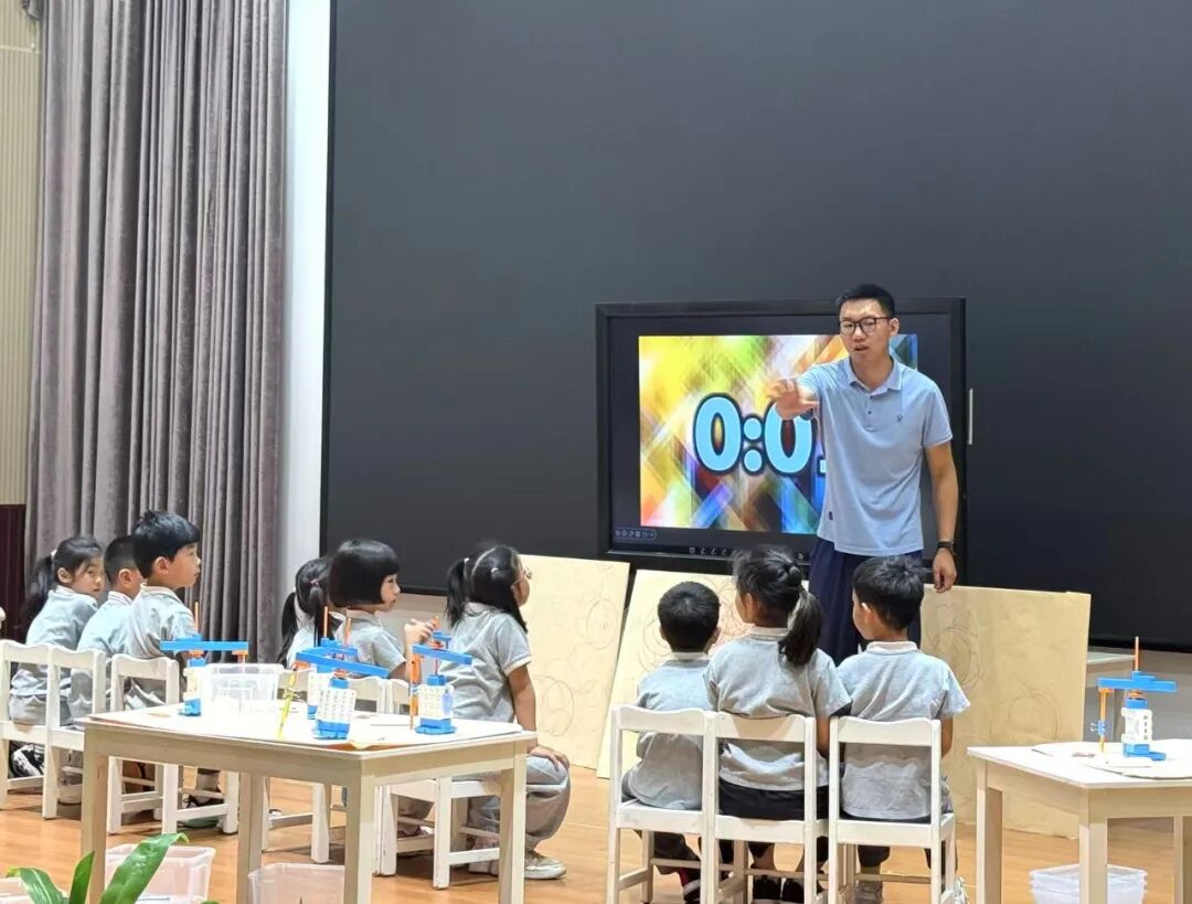 蒋老师以“设计画圆机器”为任务驱动,引导幼儿通过细致观察机器人结构、反复尝试操作遥控器,自主探究齿轮传动、圆弧轨迹等,充分激发起幼儿的好奇心与求知欲,并通过主动拆解问题,帮助幼儿验证猜想。在活动过程中蒋老师一直用“过程比结果更重要”来鼓励幼儿在试错中积累经验,在探索中感受科学魅力,真正实现以“玩”促学,以“思”启智。