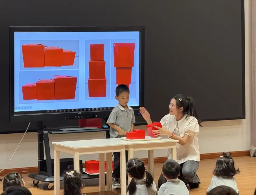 黄老师以班级幼儿“垒高塔楼”“套叠收纳”的游戏经验为切入点,设计了一节以“大小排序”为核心的小班数活动《好玩的纸盒》,活动中幼儿通过“三个盒子玩一玩”、“盒子捉迷藏”等游戏,在直接操作中感知“大、中、小”的序列关系。