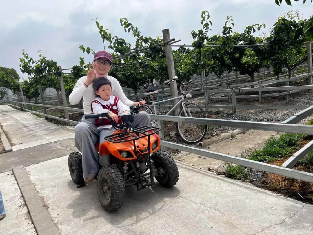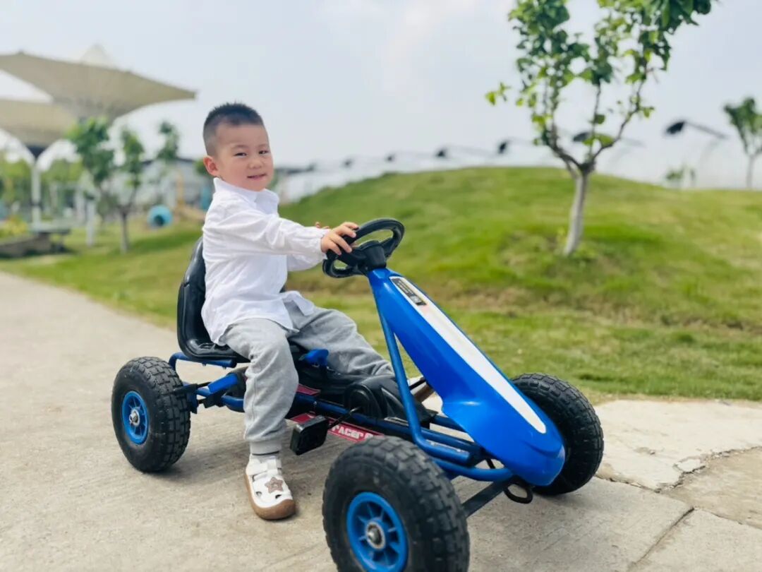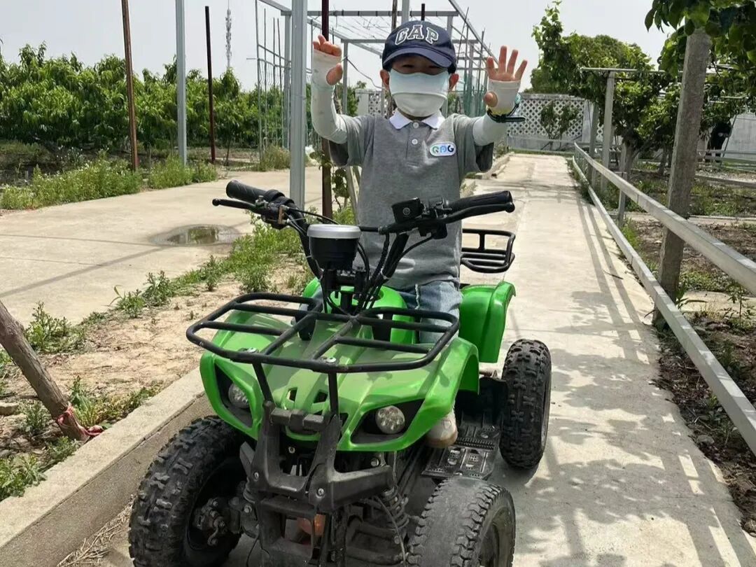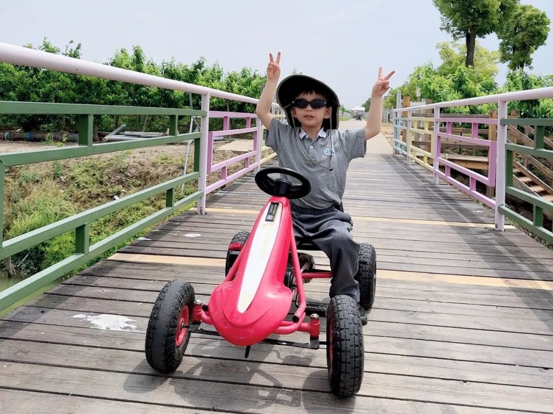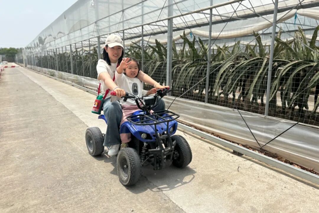 阳光透过火龙果棚洒下斑驳光影,小勇士们和爸爸妈妈驾驶着迷你卡丁车出发啦!“嘟嘟”的引擎声中,宝贝们兴奋地挥舞着小手,银铃般的笑声此起彼伏。亲子并肩前行的温馨画面,让这场卡丁车探险成为了最甜蜜的亲子时光。