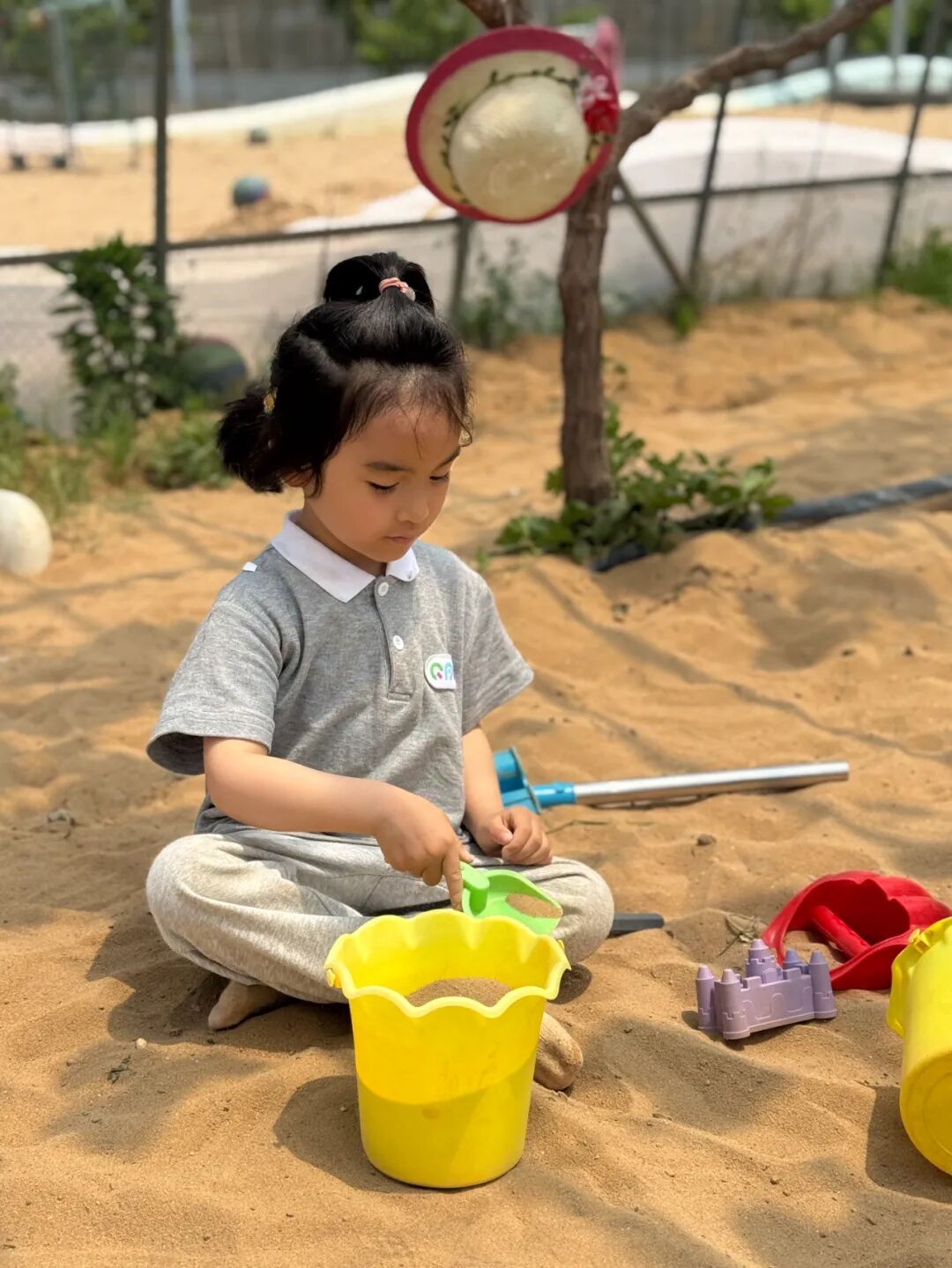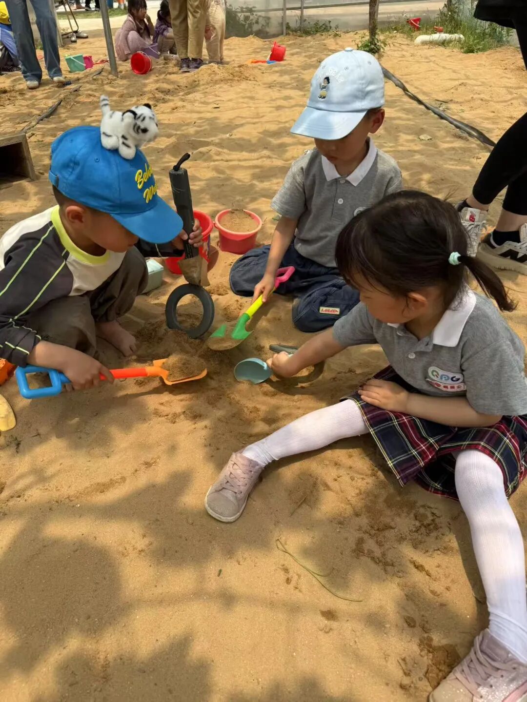 在洒满阳光的“沙池寻宝区”,细软的金沙在指尖流淌,闪烁着细碎的光芒。爸爸妈妈和宝贝们手持探测仪、迷你铲,齐心协力在沙坑中寻找“宝藏”。每当发现新的“宝藏”,孩子们的眼睛便亮得像星星,兴奋地欢呼起来。当探测仪发出“滴滴”的提示音,他们立刻跪坐在沙堆前,小手紧握塑料铲,小心翼翼地挖掘“金币”。