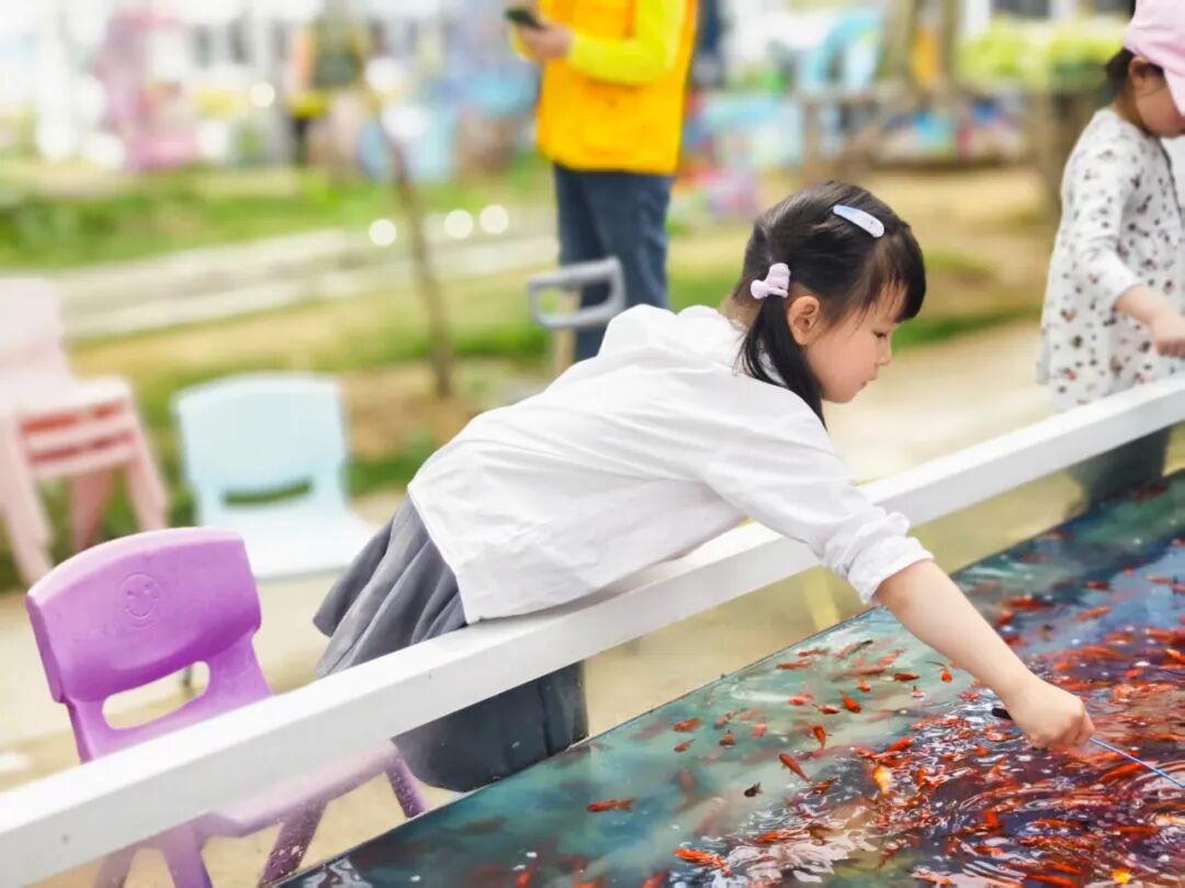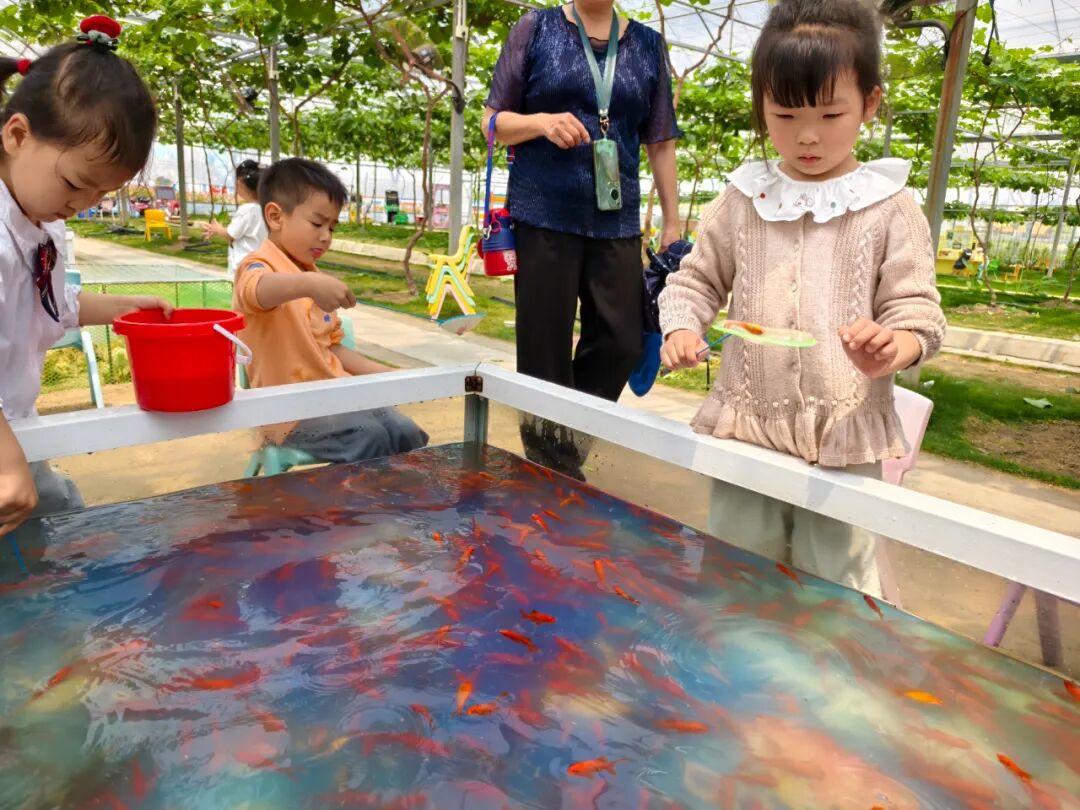 可爱的孩子们化身喂鱼小天使,胖乎乎的小手高举奶瓶。看着鱼儿们争先恐后地游来觅食,他们发出“咯咯”的笑声。当小网兜轻轻划过水面,捞起几尾活泼的小鱼时,孩子们瞪大双眼,奶声奶气地欢呼着,整个棚内充满了童真与欢乐。