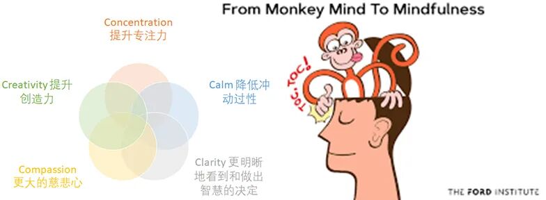 孩子的大脑常被比喻为一只精力充沛的小猴子,不停地从一棵树跳到另一棵树,也就是“心猿”。而正念要做的,便是帮这只小猴子在一棵树上多停顿一会儿,有意识的带着好奇,关注当下。当这样的驻足得到专业引导和长期的练习,将为儿童带来五个益处:提升专注力、降低冲动过性、明晰的看到和做出智慧的决定、提升创造力,和更大的慈悲心。