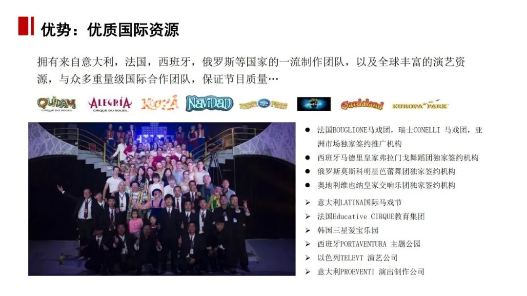 集团具备丰富的行业优势资源,以优质内容IP为核心,广泛开展舞台剧、影视、文旅演艺、动漫游戏、文化衍生品、演艺经纪、文化基金及文化地产等各个领域的投资、合作和运营。集团以一流的团队为支撑,通过科学的孵化机制,国际级的策划、制作和市场推广,有效的风险控制,创新的产业基金平台驱动,覆盖包括文化演出院线、PC端与APP端、剧院管理与销售系统、CRM与财务等在内的全产业管理平台,搭建全内容、泛娱乐运营模式和全产业链的业务架构,形成文化产品价值的立体化、矩阵式延伸,最终实现最优综合收益。同时,集团还积极开展在娱乐营销、粉丝经济、文化教育、金融创新以及基于互联网技术的娱乐终端等各个领域探索与实践。