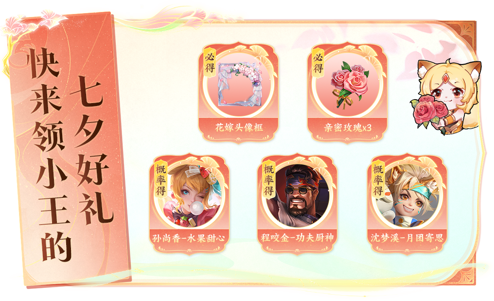 送礼狂狐的含金量还在上升!点击下图参与活动,必得花嫁头像框、亲密玫瑰*3。还有孙尚香-水果甜心、程咬金-功夫厨神、沈梦溪-月团寄思等好礼等你赢~