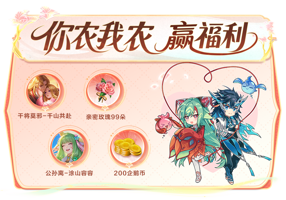 除了你侬我侬,还要你农我农!点击图片前往活动推文参与互动,干将莫邪-千山共赴、亲密玫瑰99朵、公孙离-涂山容容、200企鹅币等你赢!