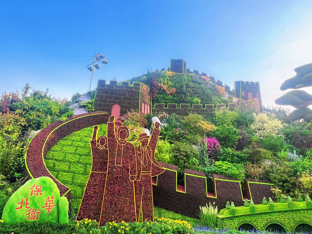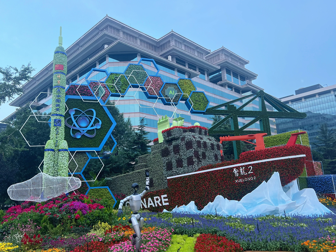 “科技强国”花坛则展现了中华民族面向未来的豪情。雪龙2号破冰船勇闯极地,神舟飞船翱翔九天,机器人灵活操作,这些科技成果不仅是国家实力的象征,更是民族自强不息精神在新时代的延续。