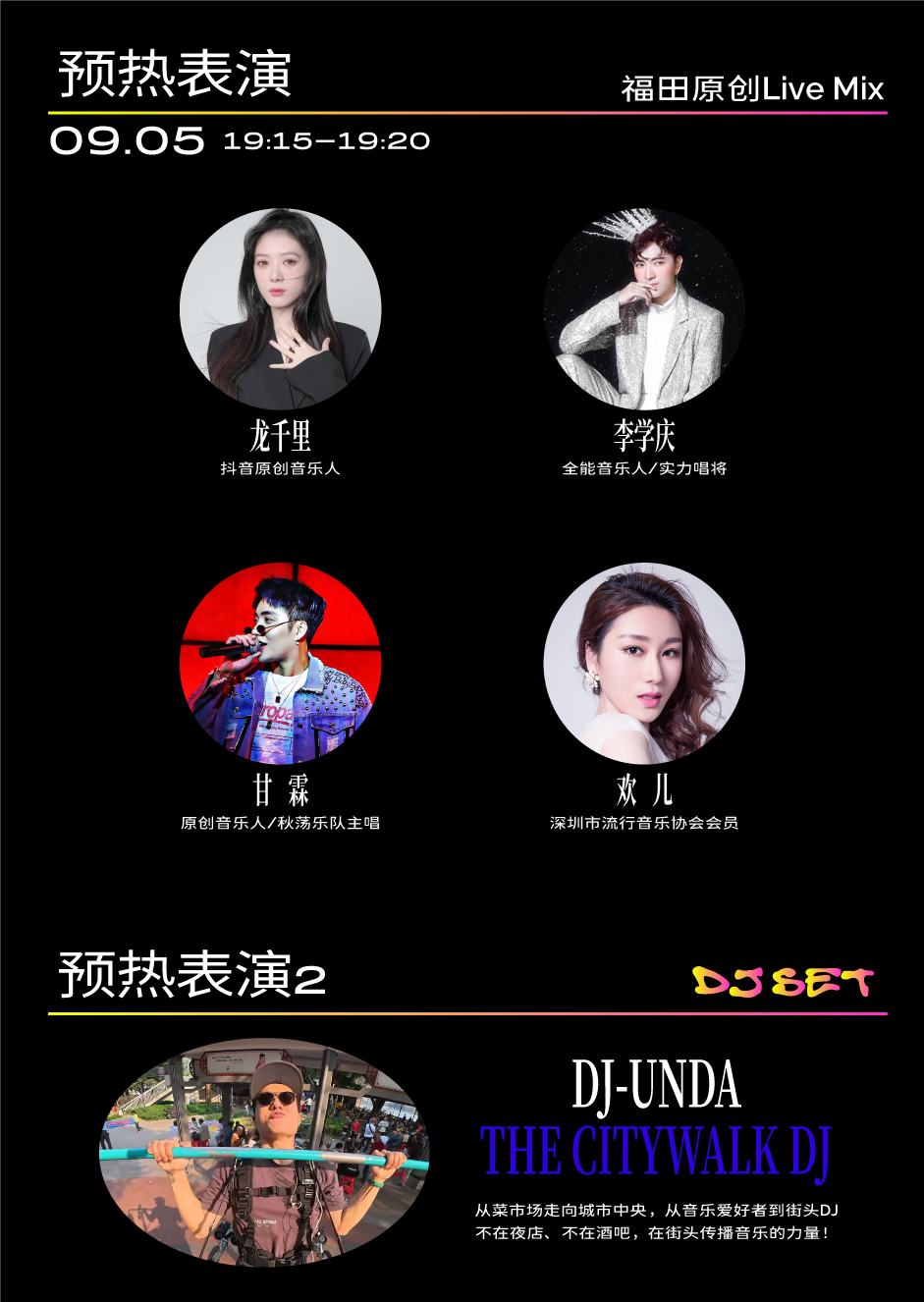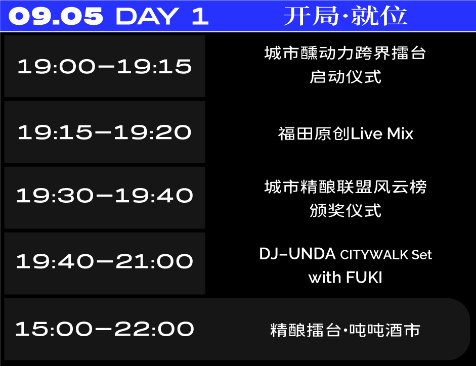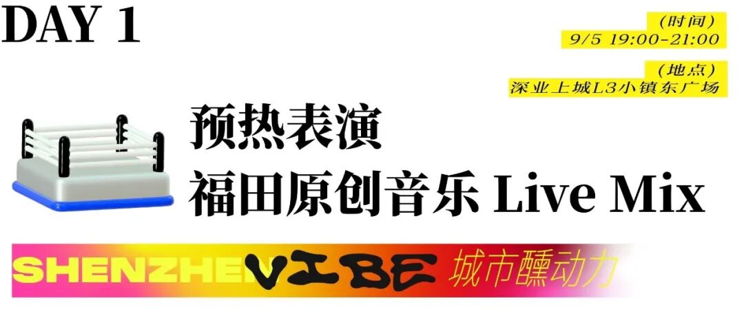 城市醺动力跨界擂台启动仪式将于9月5日19:00正式启动。当晚的演出将特别设置“福田原创Live Mix”环节,集中呈现多首源自于福田的动人旋律——从《深爱》《向海而生》到《开在我心里的那朵花》,再到从福田音乐赛事中脱颖而出的匠心之作《理想之城》,一首首承载深圳故事的原创作品接连唱响。98音乐周始终聚焦福田原创力量,聆听城市心跳,传递属于深圳的音乐回响。