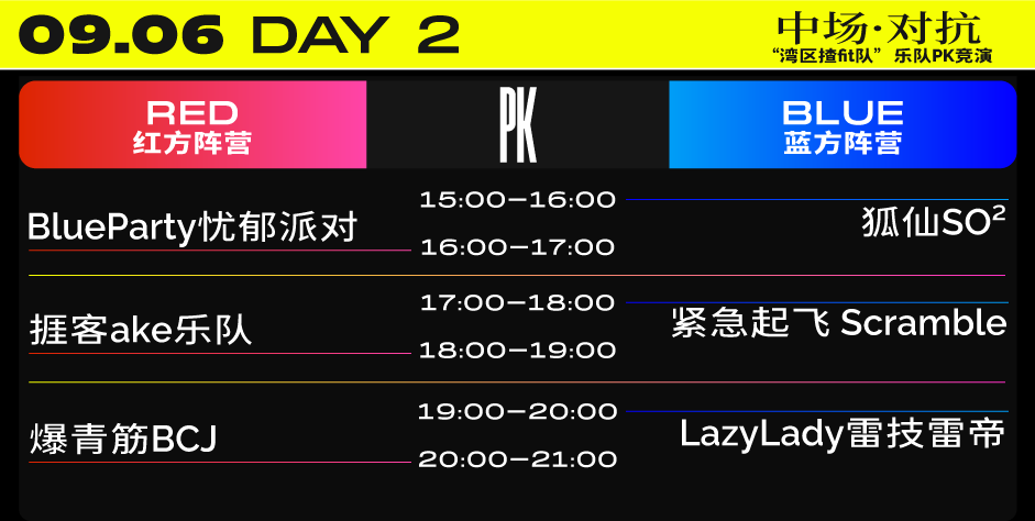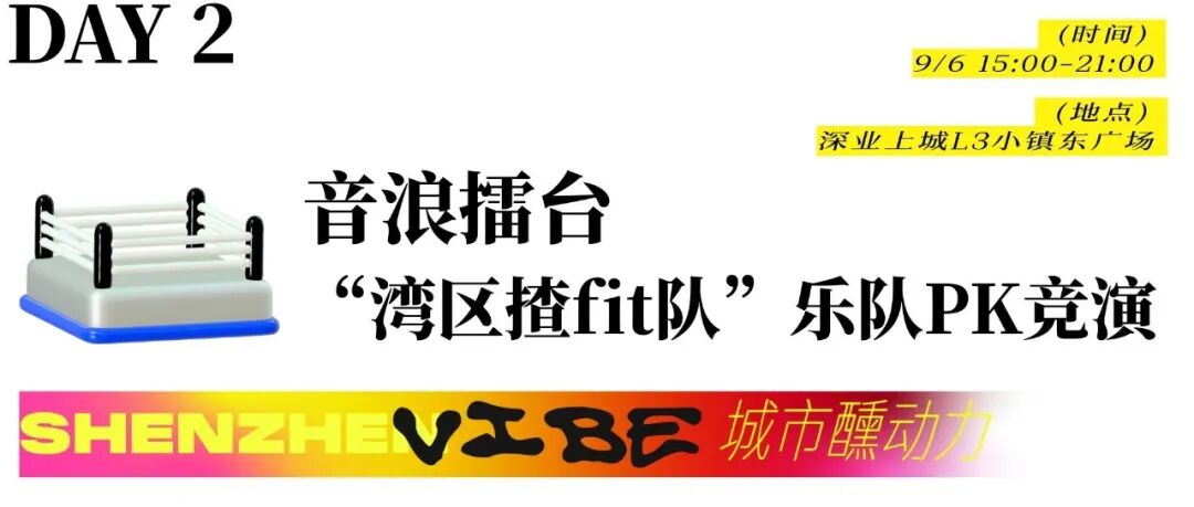 战斗正酣,音浪擂台发起挑战!本次活动板块之一——“湾区揸fit队”乐队PK竞演即将在9月6日15:00开启,演出以拳击比赛擂台为原型,创新打造国内首个“拳力醺战擂台”演出舞台,深度融合红蓝对抗的竞技主题,构建充满热血与张力的沉浸式互动现场。