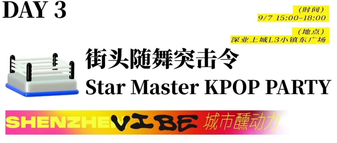STAR MASTER KPOP PARTY 由匠星音乐学院倾力打造,以「开放舞台」为核心概念,致力于为所有热爱表演、钟情KPOP、敢于表达自我的年轻人,提供一个闪耀自我、释放光芒的舞台。9月7日15:00-18:00,街头随舞突击令,召集多组舞者以舞团出征,让心跳与音乐同频,带现场观众感受肆意张扬的青春活力。