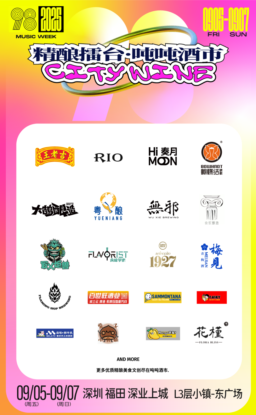 RIO(锐澳)、奏月HiMOON酿造、风味学家Flavorist、蝴蝶结精酿酒馆、粤酿、会饮酿造、622houhou、㝡乂炬兽、火跃酿造、无邪酿造、超级波克1927臻选精酿啤酒等来自全国各地的先锋精酿厂牌&餐饮品牌惊喜亮相在音乐与运动的场景中,Cheers,微醺到深夜!现场更有王老吉等美食文创强势助阵,点亮九月第一个周末!