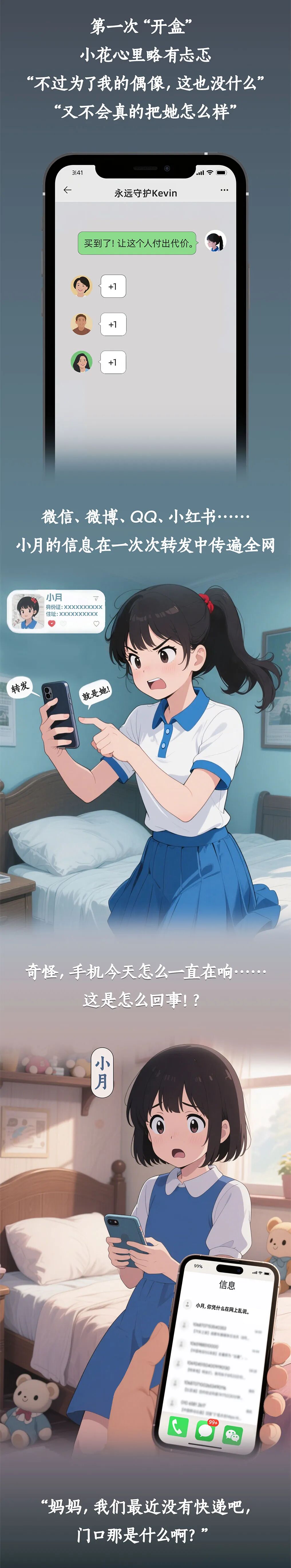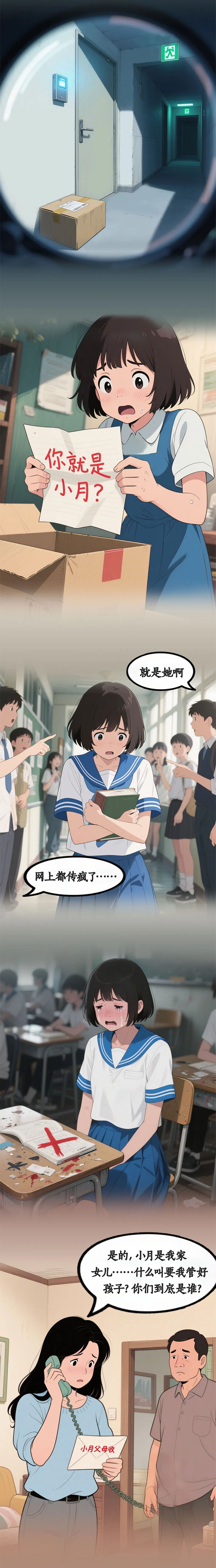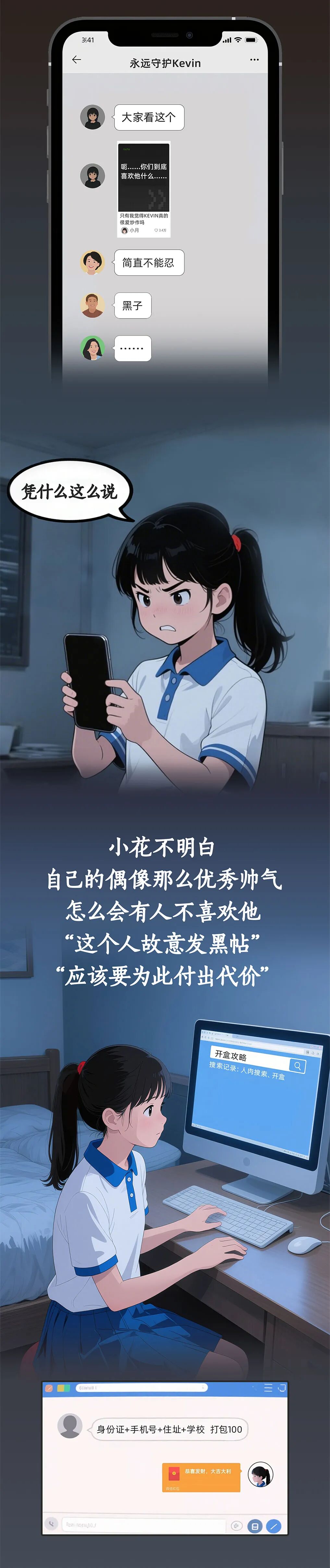 还有一种是精神上的“伤害”。言语谩骂、侮辱、捏造事实诬蔑、诽谤他人。从漫画的案例也可以看到,当“伤害”通过网络实施,基于网络平台的易传播性和匿名性,危害后果更为严重。还有一种情况也要注意,那就是“围观吃瓜”。某地一名13岁女生遭围殴,有人在旁边拍摄视频并传播,造成网络围观,使受害人心理遭受更大伤害。这种行为同样是不允许的。