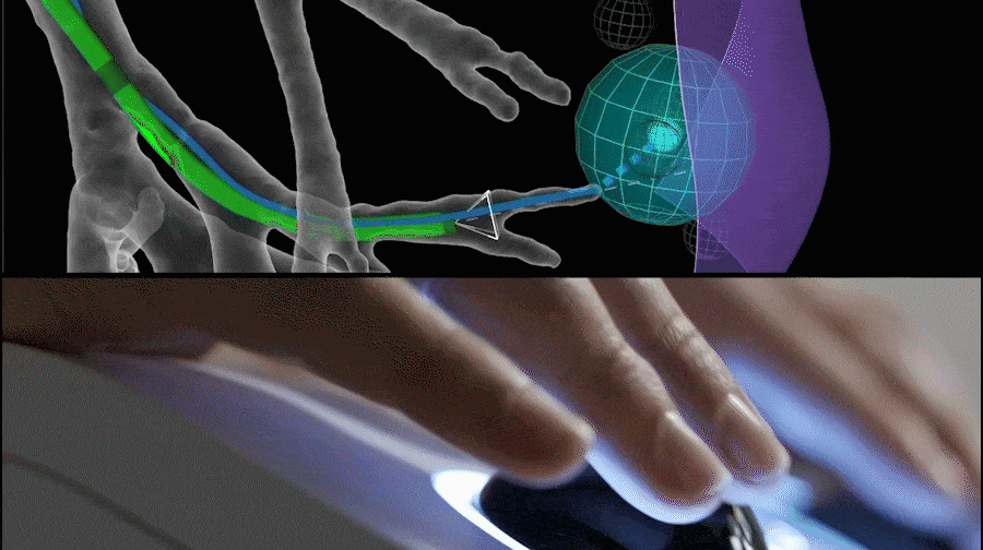 临床医生可以通过操作台上的滚轮和轨迹球操控机械臂和导管头端的弯曲,快速、精准直达靶点。