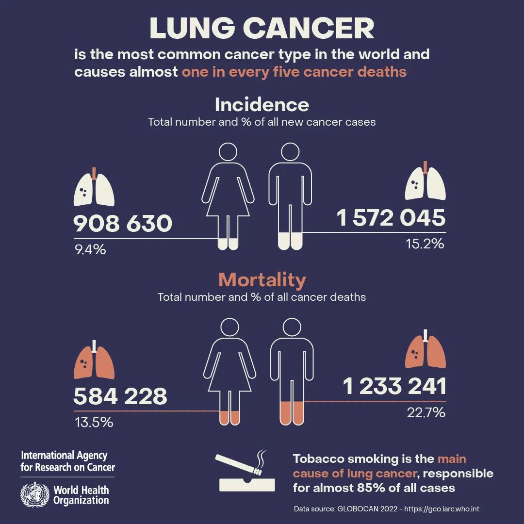 全球范围内,肺癌死亡率高居所有癌症首位,其导致的死亡人数是第二大常见癌症死因——结直肠癌的两倍以上[1]。