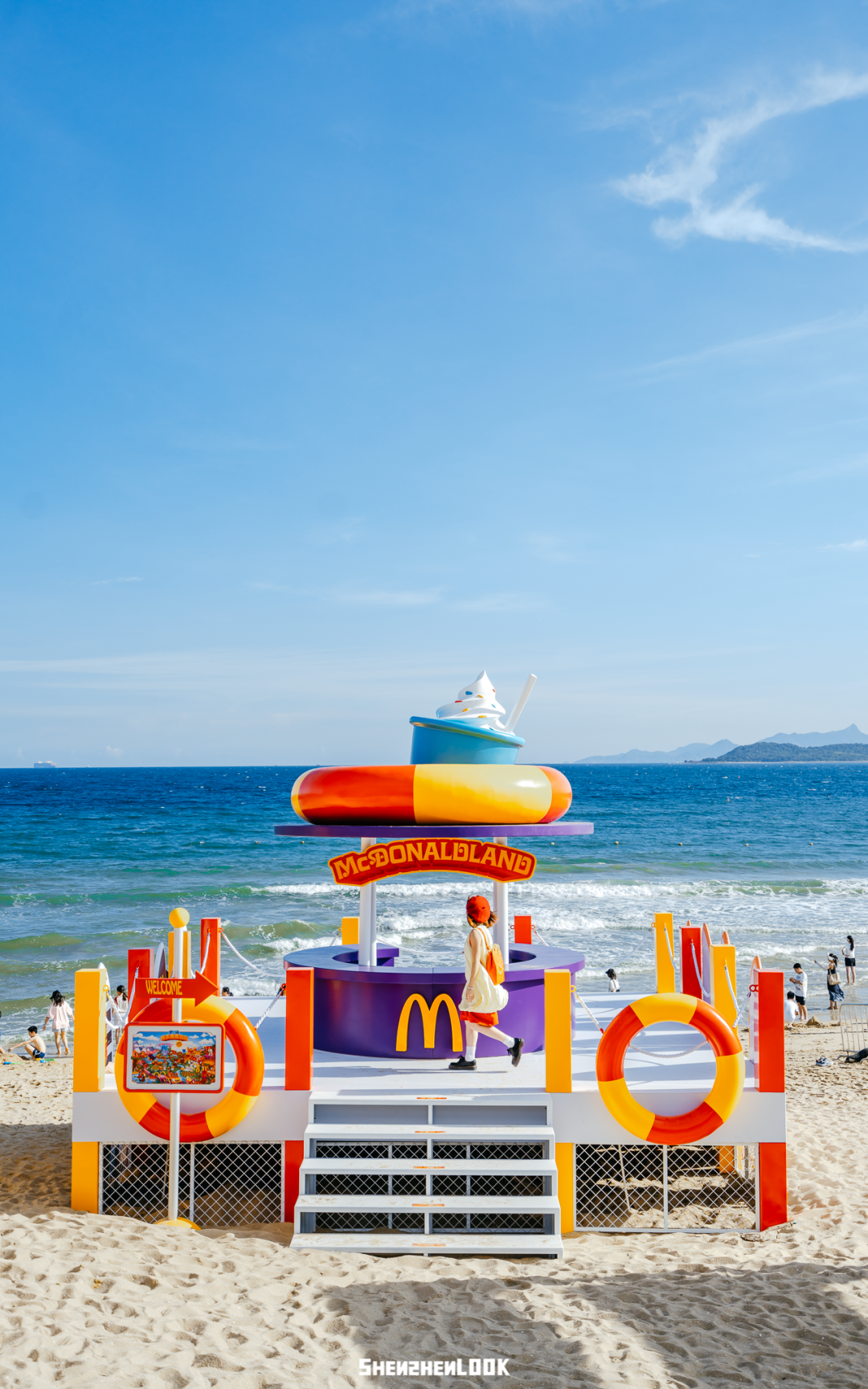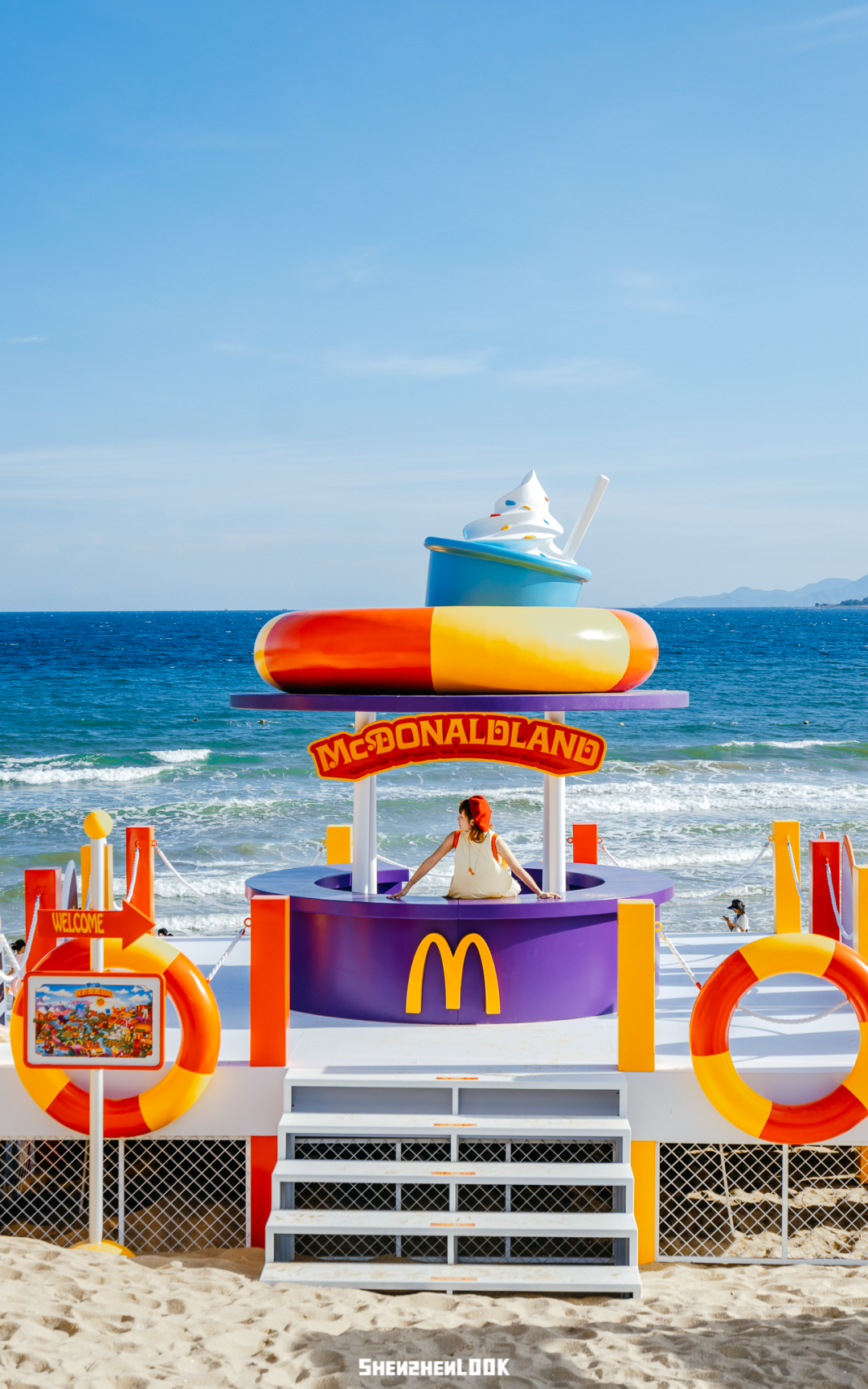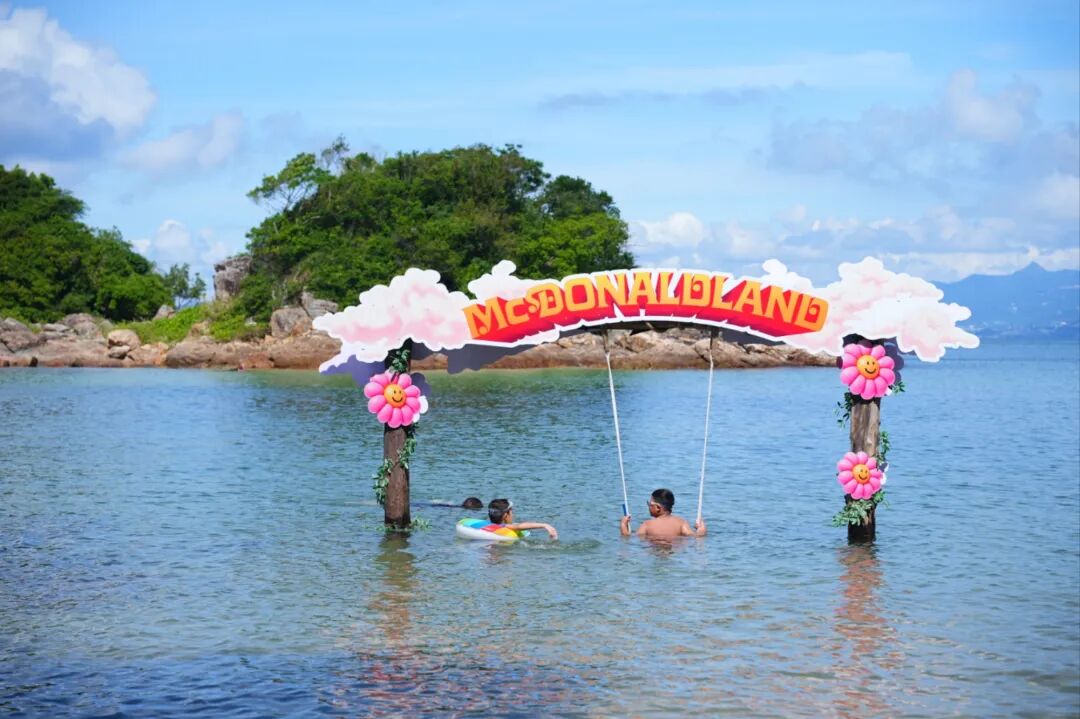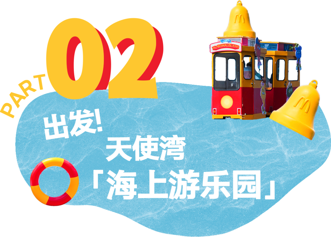 巡游第一站来到位于深圳大鹏的云海天使湾。麦当劳在这里打造了麦当劳小火车、海边麦当劳全家福长椅、麦麦海上秋千、快艇等游玩项目,像是一座开在海上的“麦当劳游乐园”~