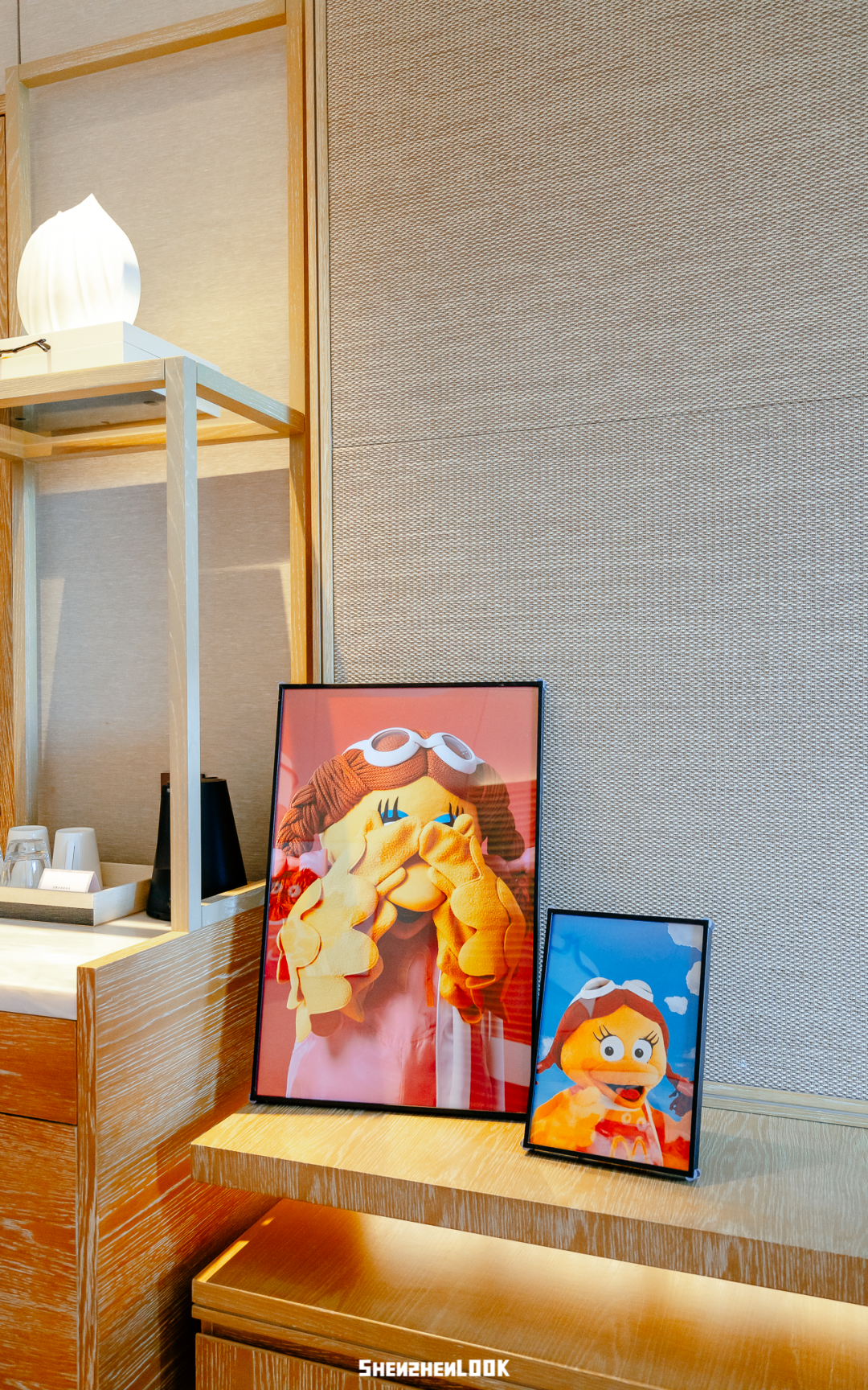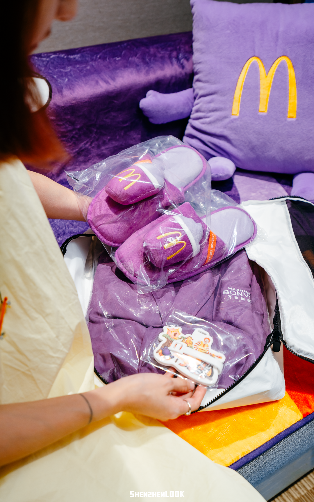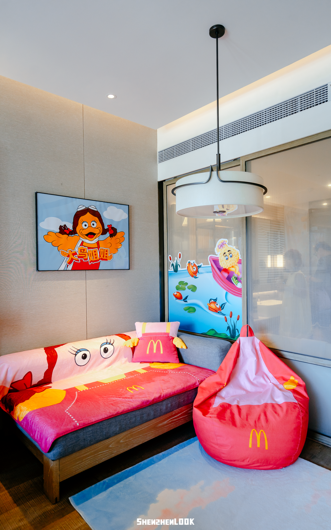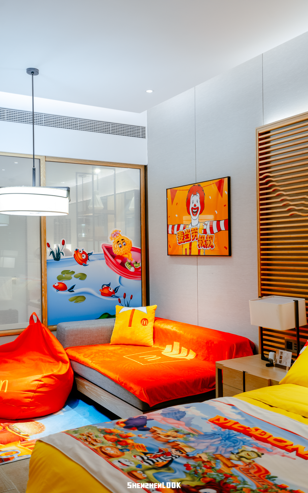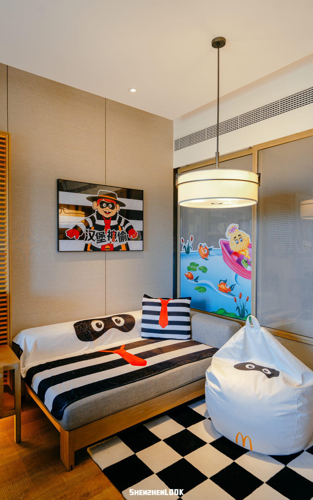 这次“麦麦岛”活动期间,麦当劳在深圳金沙湾佳兆业万豪度假酒店,打造了4间四小福的主题套房,房内的床上用品、沙发区都是四小福元素的设计。