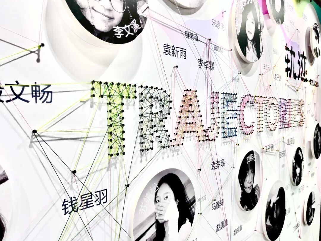 本次艺术展特别设计了“轨迹”主题互动墙。墙面上是本次艺术节81位参展学生的名字。每一位来宾将在入口处领取到的彩色的丝线缠绕在互动展板上,形成一道道独特的“轨迹”。
