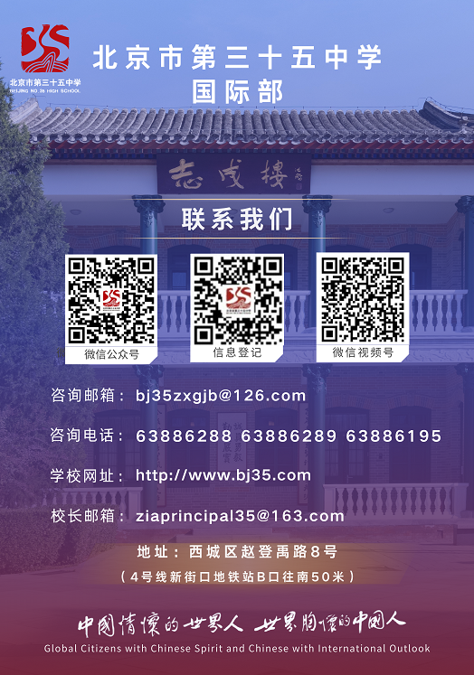 北京市第三十五中学艺术项目是北京公立国际部成立最早的艺术项目。自成立以来,项目的课程与整体设置历经多次优化创新,项目融合了中国国家课程和美国大学先修课程(Advanced Placement,简称AP课程),构建了中西合璧的融合课程体系,集高中学术课程、艺术基础能力培养课程、创意与专业进阶课程、美国大学先修课程于一体,为以艺术与设计为专业意向的学生提供三年制国际艺术教育。