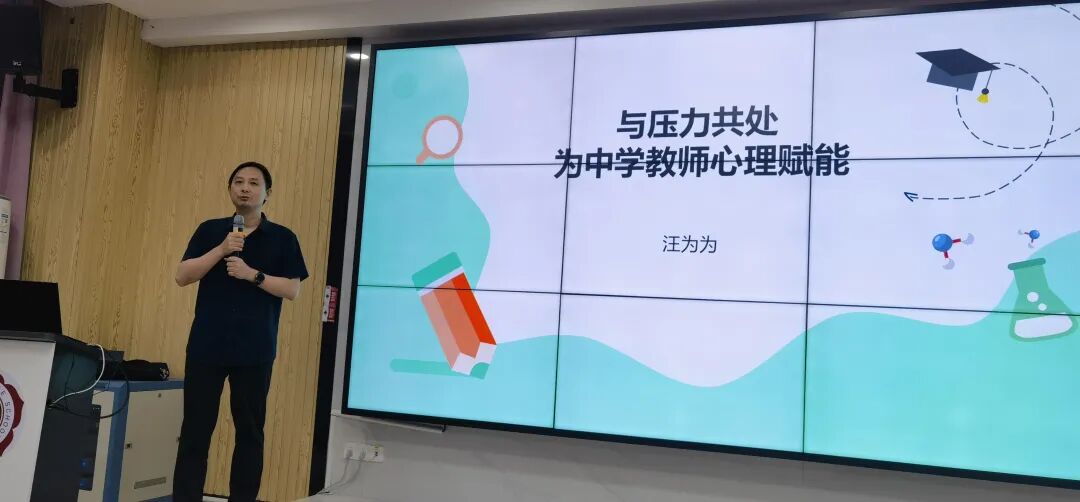 中学教师,肩负着培育祖国未来栋梁的重任,每天在教学一线辛勤耕耘,压力如影随形。为了帮助老师们更好地与压力共处,为心灵赋能,5月21日学校特别邀请到心理领域的权威专家武警广东省总队医院汪为为在五山校区一楼阶梯教室给初中全体班主任带来一场别开生面的心理减压放松团体辅导活动。