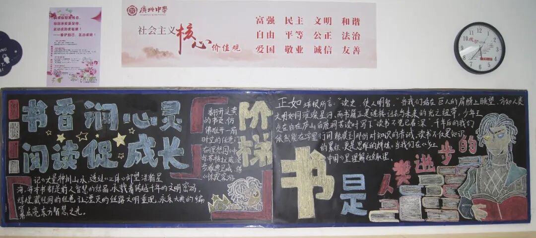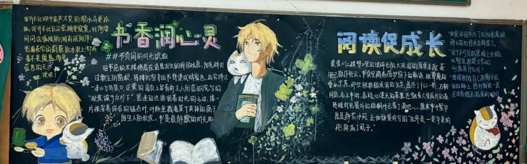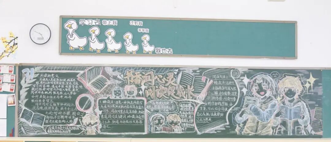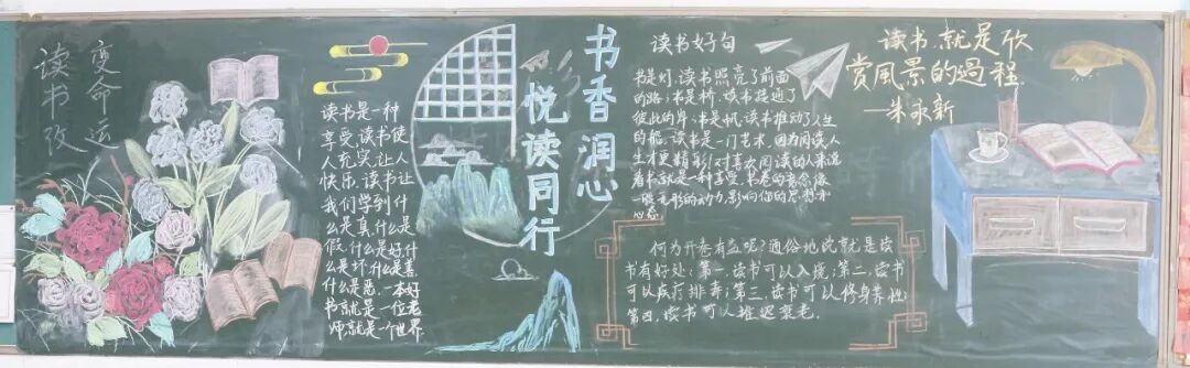 以“书香润心灵,阅读促成长”为主题的黑板报评比活动,也在各班级火热展开,同学们用粉笔描绘阅读之美,展现班级独特的读书文化。