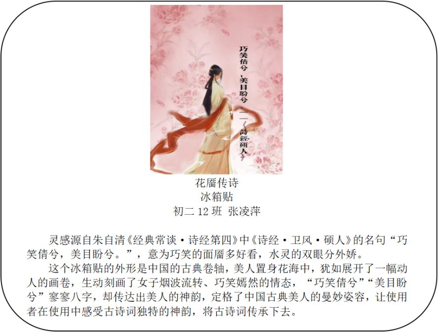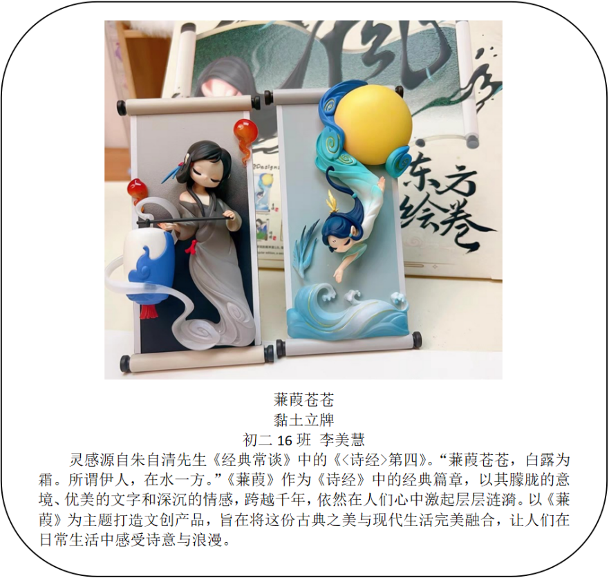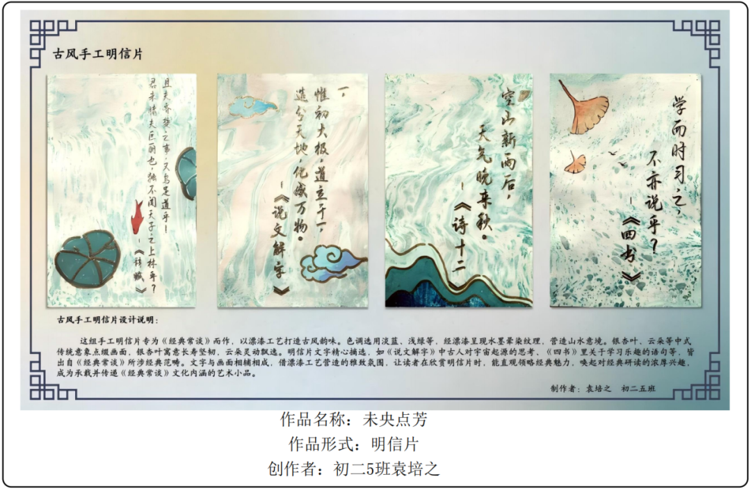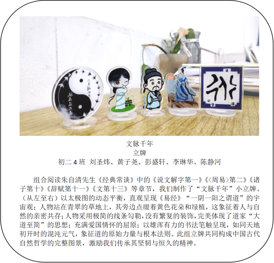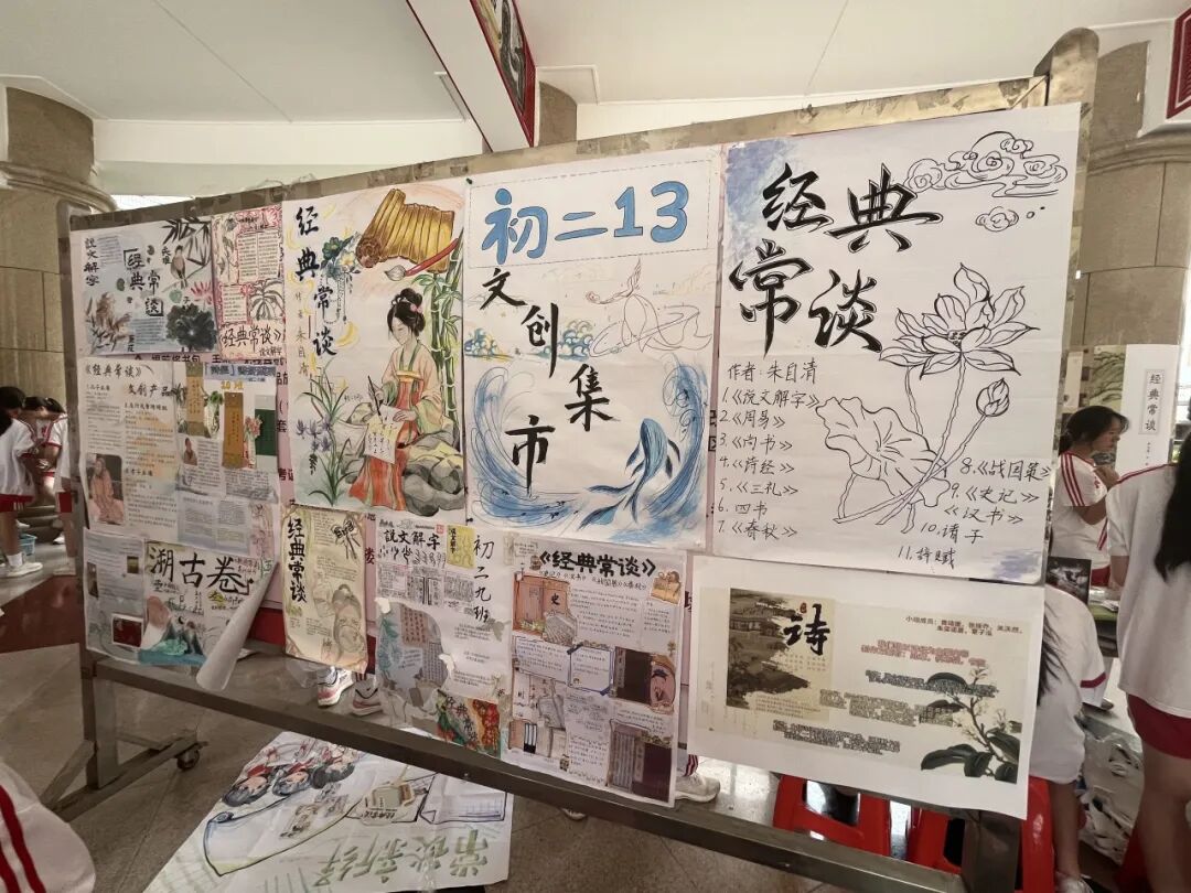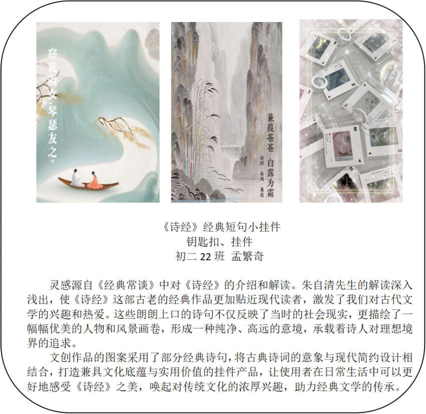 活动前期,各班以《经典常谈》中的经典著作为核心,展开了一场横跨千年的文化之旅。从《论语》的智慧哲思到《诗经》的诗意浪漫,从《说文解字》的汉字之美到传统节日的民俗魅力,36 个班级的文创小组脑洞大开,将古籍中的符号转化为充满现代感的文创作品。