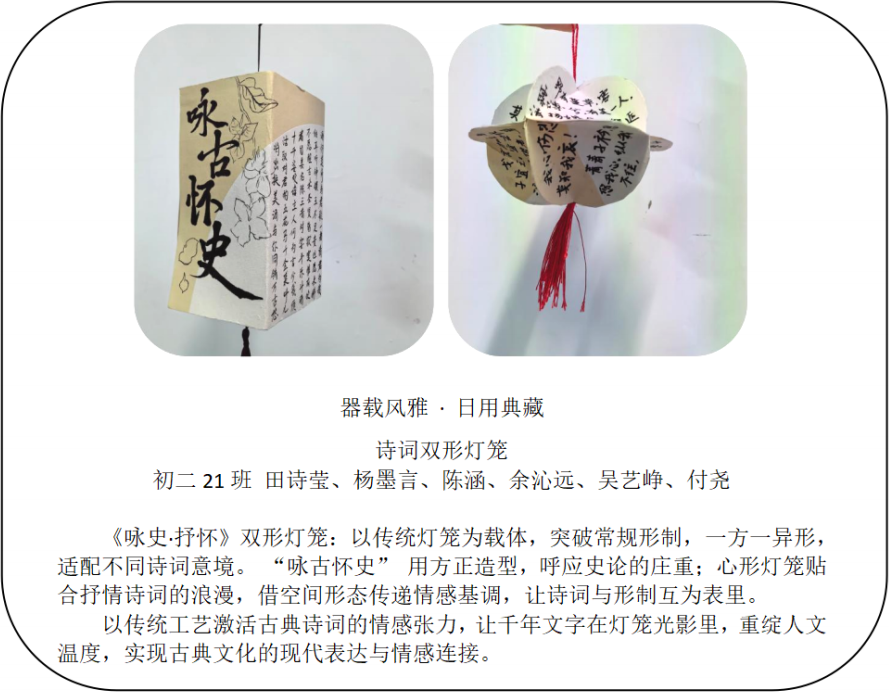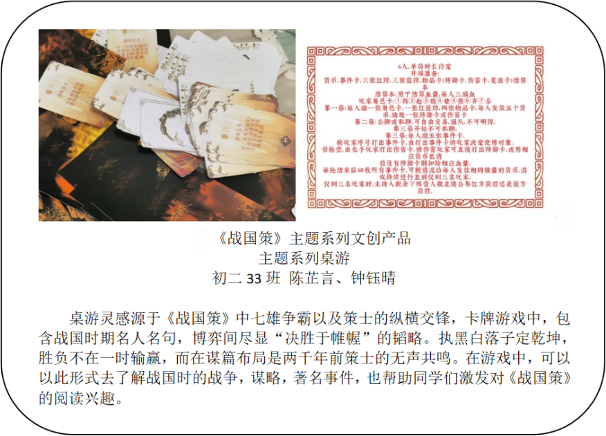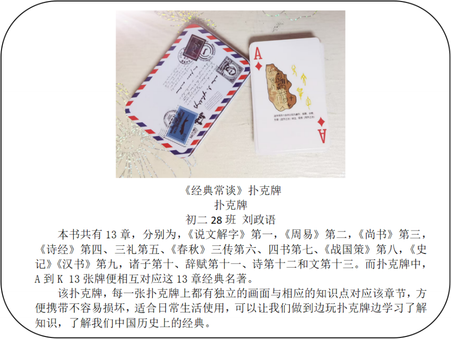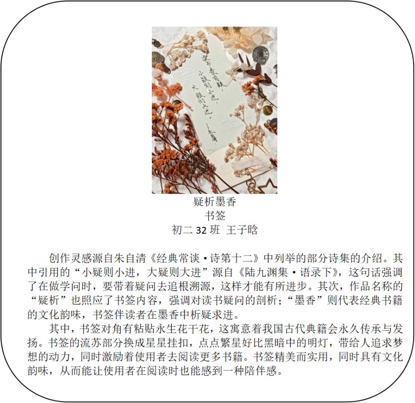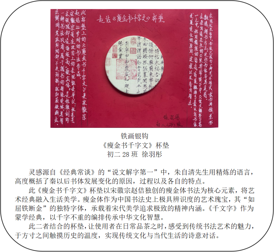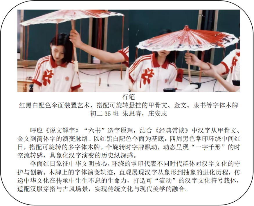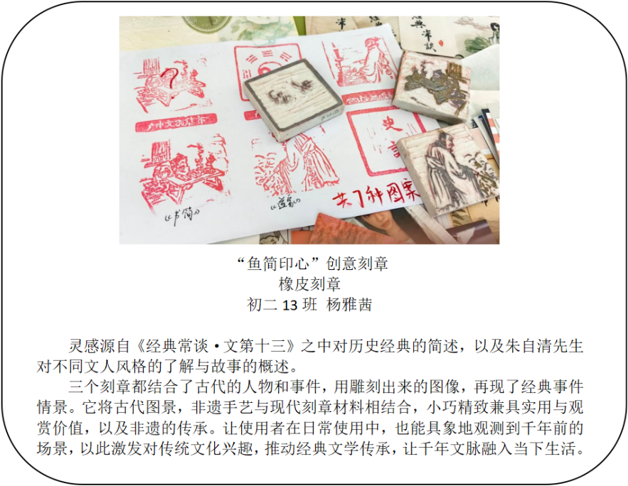 活动前期,各班以《经典常谈》中的经典著作为核心,展开了一场横跨千年的文化之旅。从《论语》的智慧哲思到《诗经》的诗意浪漫,从《说文解字》的汉字之美到传统节日的民俗魅力,36 个班级的文创小组脑洞大开,将古籍中的符号转化为充满现代感的文创作品。