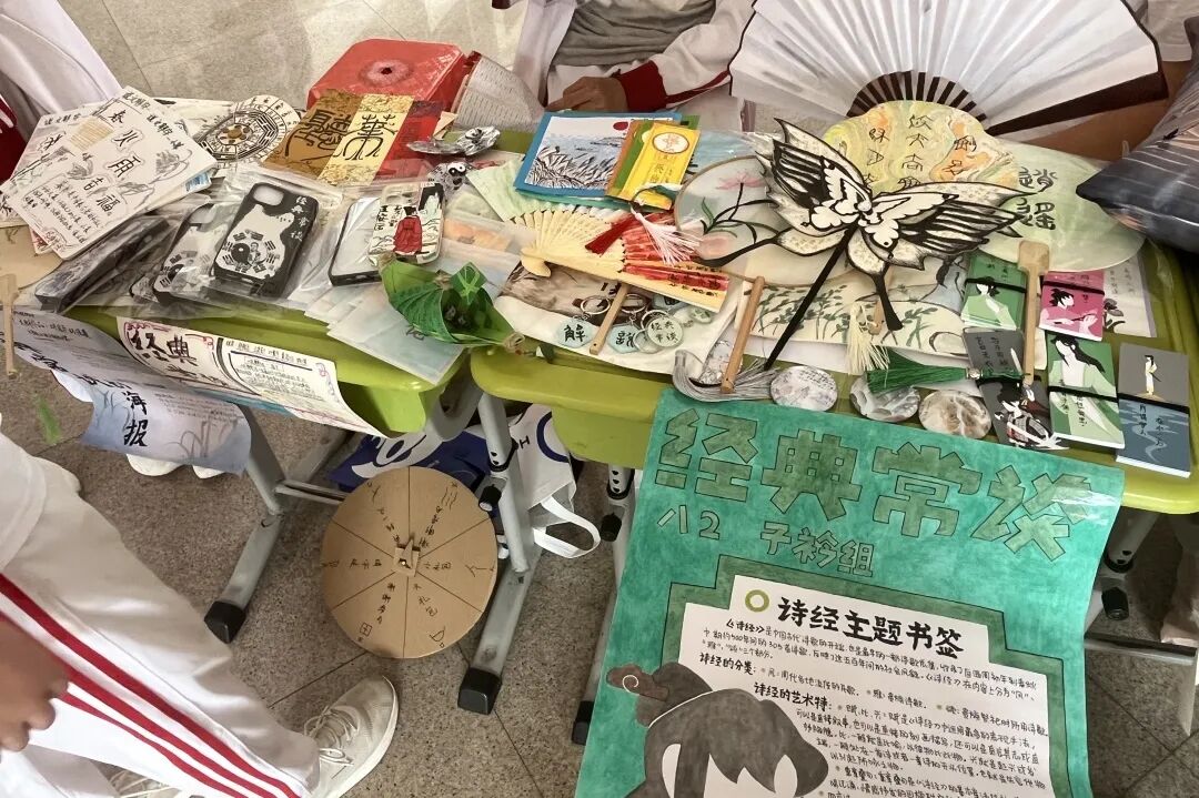 “走过路过不要错过!快来看看我们的《诗经》立牌,感受先民的浪漫!”“来看《论语》文创书签,学霸同款助你金榜题名!” 活动现场,各班级的 “小掌柜” 们使出浑身解数,引得参观者们纷纷驻足。