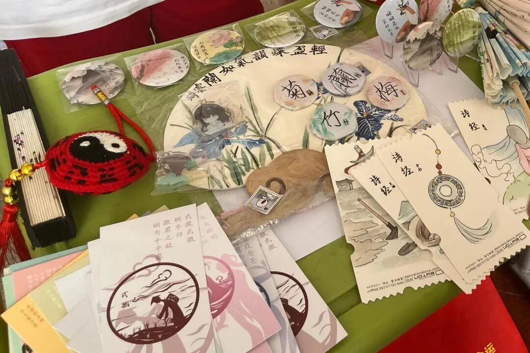 漫步集市,你会看到印有《诗经》内容的帆布袋,带有东方美学的漆扇,刻上了各种诗词的玻璃瓶子,搭配水墨插画的书签,各种文创产品数不胜数。