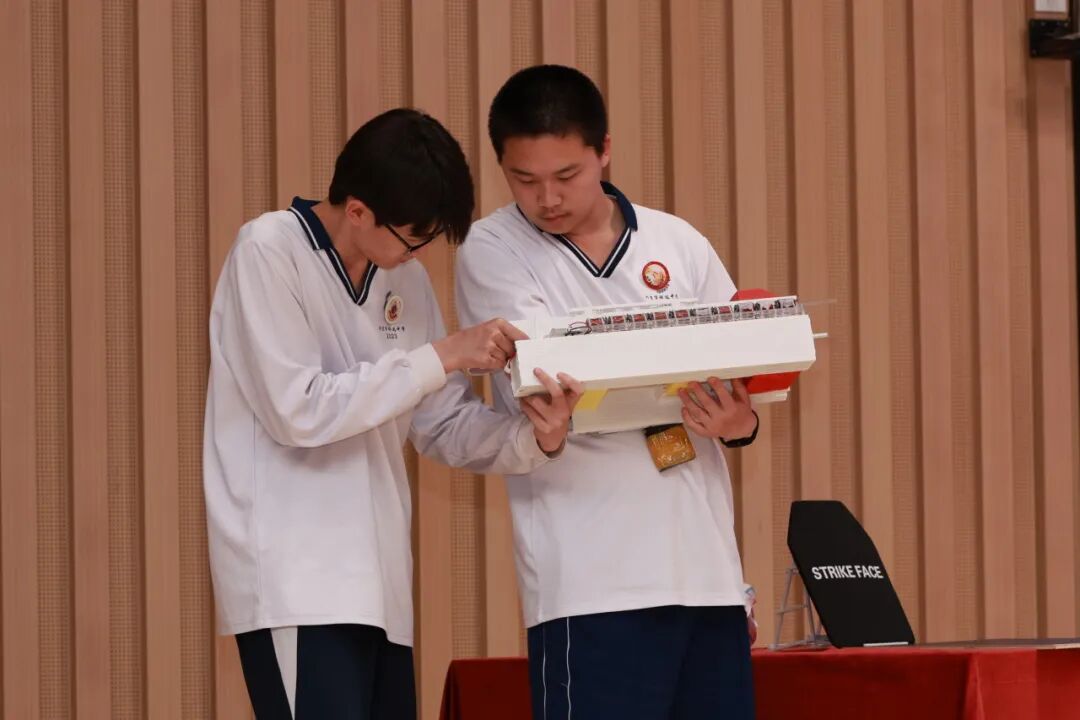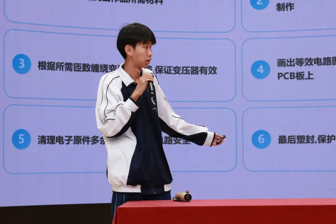 高二1班廖鹏越、檀凯与高二2班陈淮晟合作的电磁炮模型,将前沿科技原理浓缩于精巧模型中,引爆全场好奇心!