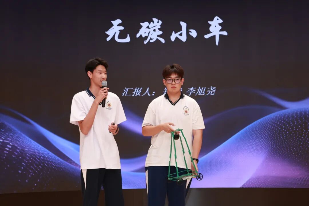 高二2班李旭尧、郑楷的 “无碳小车” 设计精巧,即将征战全国赛场!它用纯粹的机械智慧,诠释了绿色动力的可能。