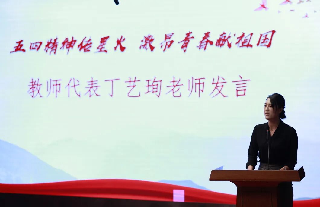活动上,青年教师代表丁艺珣老师发言。她表示,老师不仅要传授知识,更要引导学生形成正确的价值观,成为有责任感和使命感的公民。她希望同学们珍惜时间,刻苦学习,将奋斗作为青春的底色,共同继承和发扬五四精神,为祖国的发展贡献力量,点燃时代的光辉。