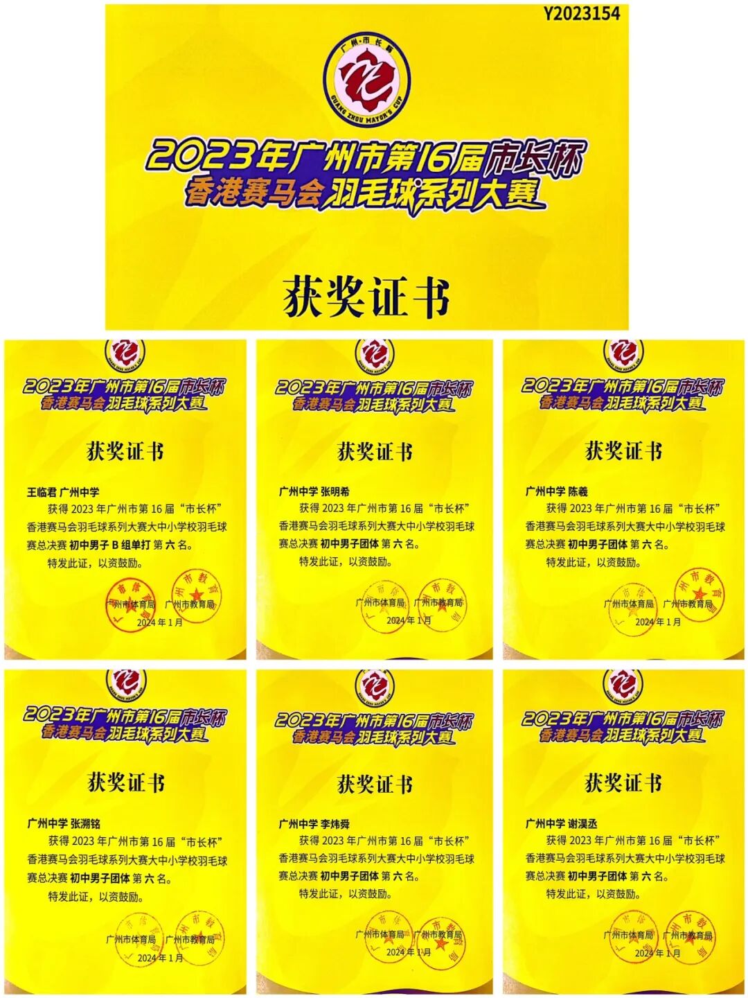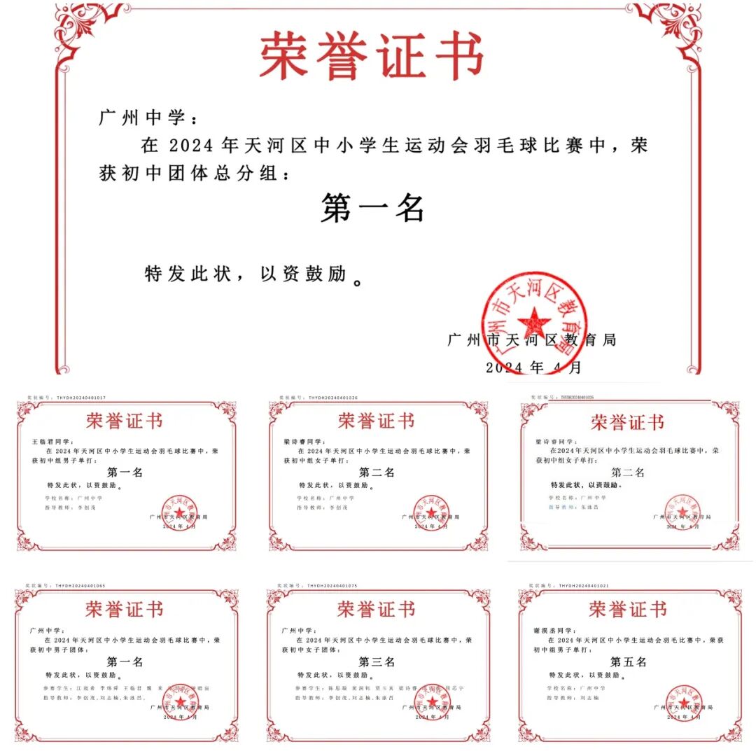 2024年1月20日,广州中学羽毛球队在2023年广州市第16届“市长杯”香港赛马会羽毛球系列大赛大中小学校羽毛球赛总决赛荣获初中组男子团体第六名和男子单打第六名的优异成绩。