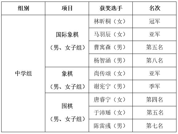 我校三棋队荣获“象棋中学组团体冠军”、“国际象棋中学组获团体季军”、“围棋中学组获团体第四名”。