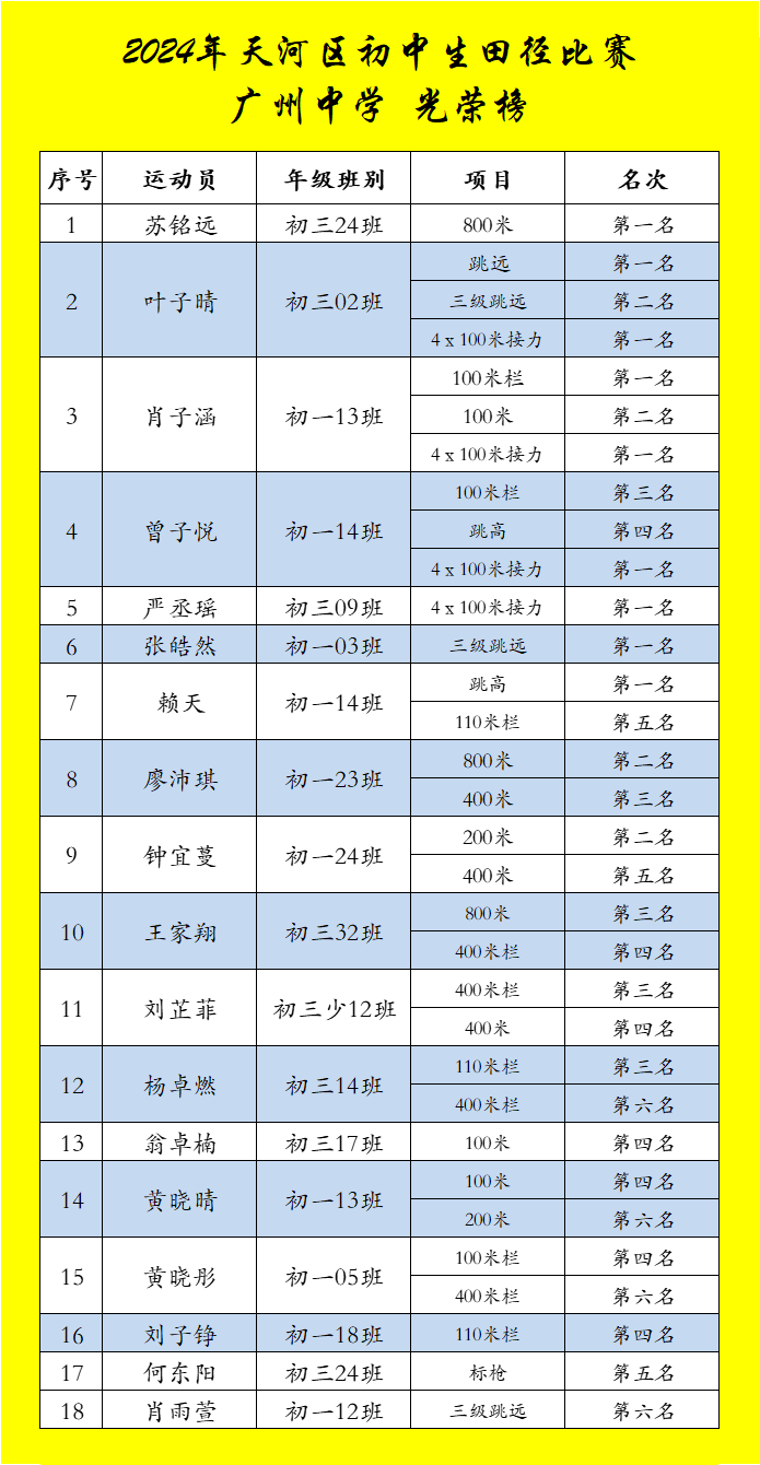 风华灼灼思进取,矢志耕耘获佳绩。2024年市、区各级比赛中,我校派出田径、羽毛球、三棋、足球、篮球、武术6支队伍参加比赛,其中荣获市级团体总分第五名1项、第六名1项,市级单项第六名1人,区级团体总分第一名4项、第二名1项、第三名1项、第四名2项,区级单项冠军25人、亚军8人、季军7人,一共96人获奖,运动健儿们奋勇拼搏,再创佳绩,诠释了广中学子良好的精神风貌。
