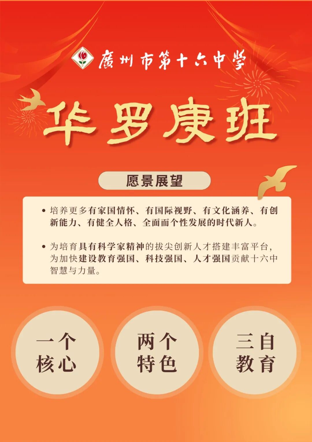 广州市第十六中学将持续深化教育教学改革,通过华罗庚班构建的创新实践,期待培养更多有家国情怀、有国际视野、有文化涵养、有创新能力、有健全人格、全面而个性发展的时代新人;为培育具有科学家精神的拔尖创新人才搭建丰富平台,为加快建设教育强国、科技强国、人才强国贡献十六中智慧与力量。