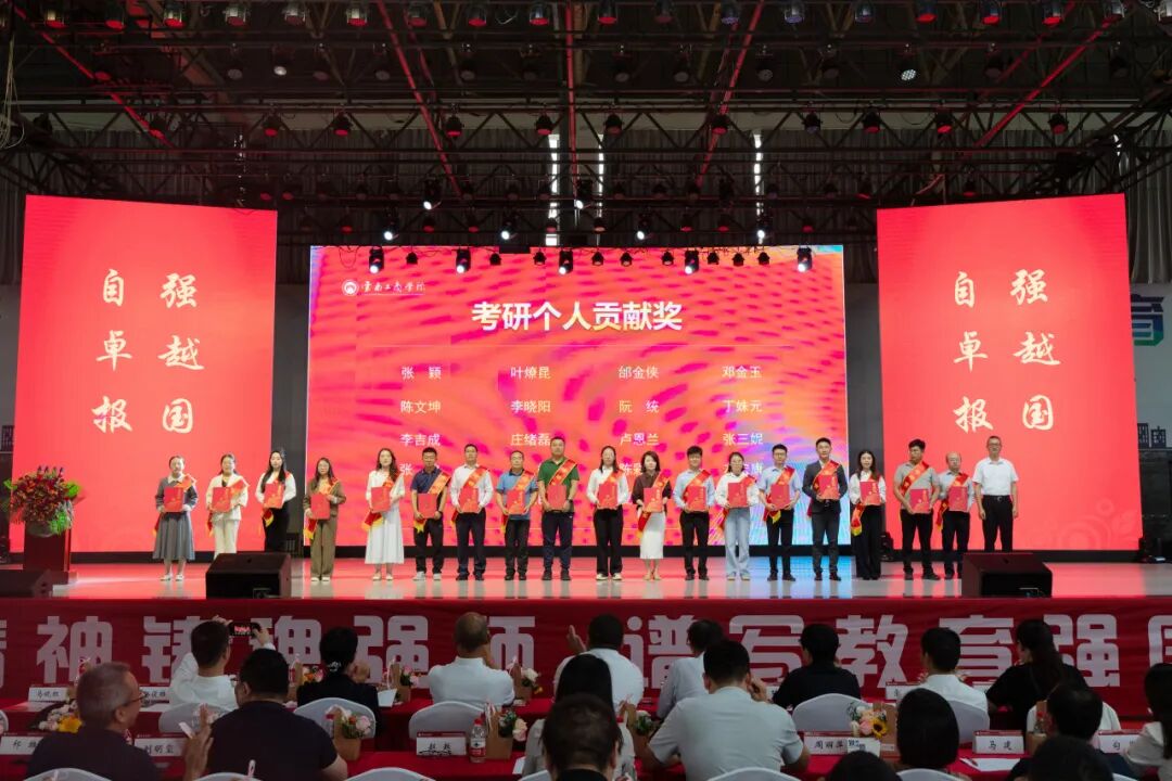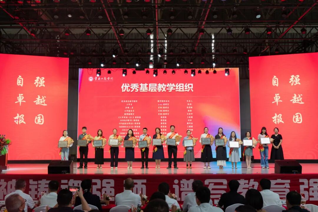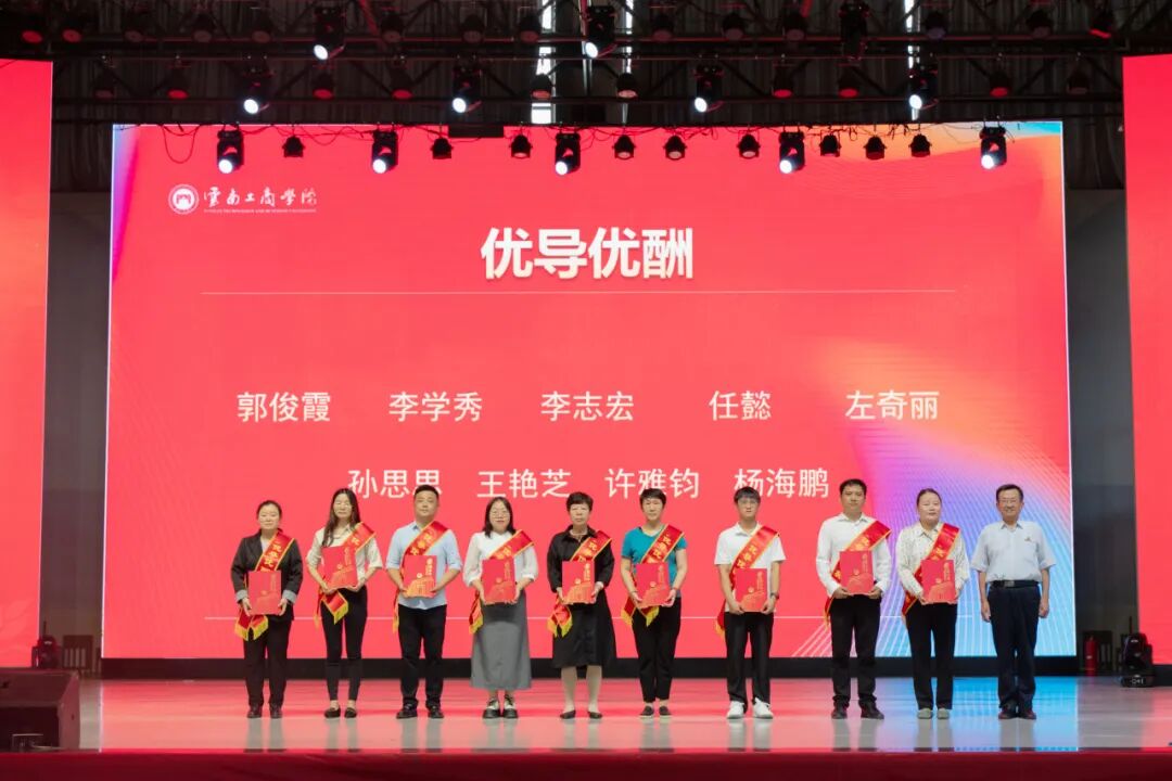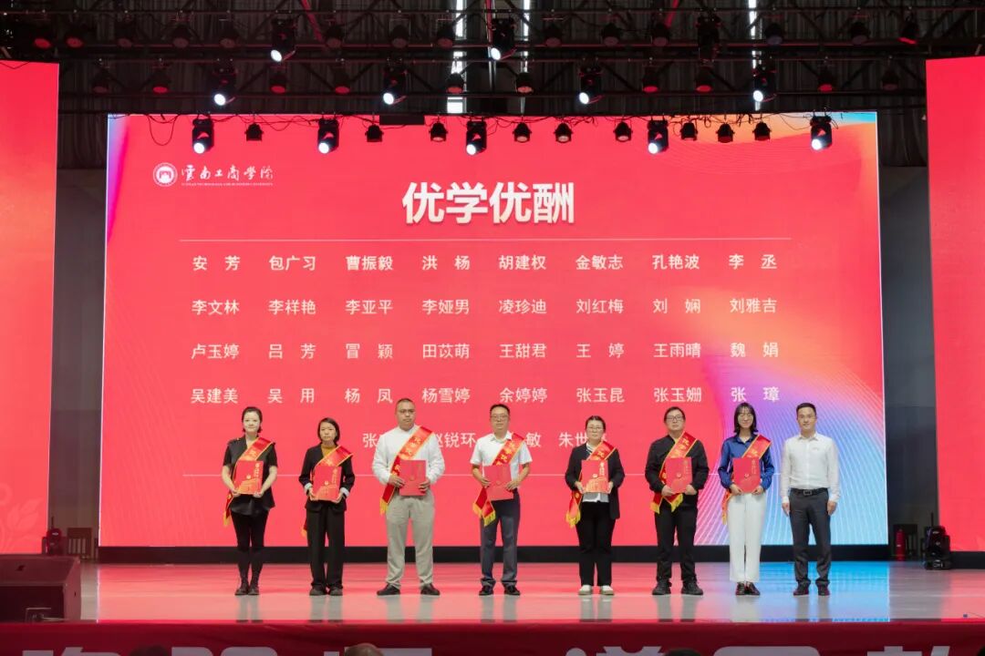 各奖项获奖教师代表上台发言,他们结合自身工作与实践,从不同角度分享了他们的育人经验与感悟,共同展现了一幅以学生为中心、全面育人、坚守使命的教育图景。他们分别从考研辅导、班级建设、教学创新、生活关怀等不同角度,生动体现了教育工作者对立德树人根本任务的深刻理解和实践。发言中不仅强调了科学规划、严格管理、学风建设等教育教学方法创新,更多次提到“用生命影响生命”“用真情传递真知”的教育情怀,突出体现了云工商教师对学生成长全程的陪伴、关爱与引领,折射出学校注重高质量发展、强化育人协同、倡导奉献与创新的教育理念,也充分展现了教育工作者扎根一线、甘于奉献、以生为本的精神风貌与职业担当。