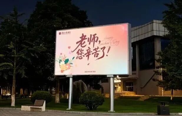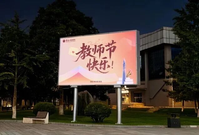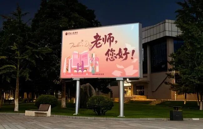 夜色渐染,温暖未央。夜晚,学校开展“为教师亮灯”主题活动。学生公寓外墙和校园电子屏次第点亮,“老师,您好!”“教师节快乐!”“您辛苦了!”等话语温暖绽放,犹如星光汇成河流。