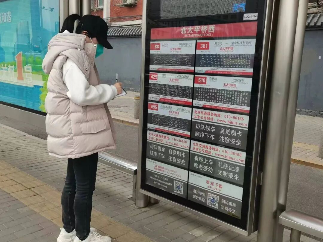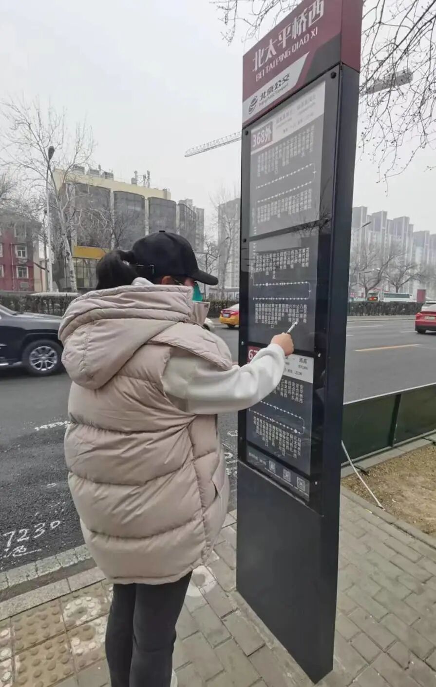 “后来我在大院中听到一些刚刚搬来这里住老年人也在谈论同站名找车不方便的事,我就思考:会不会不止有这一处车站有这样的问题,给不熟悉当地的乘客带来不便?在主辅路上同一站区内公交站的命名加上区别标志能不能有效解决这个问题?随后我便开始进行实地走访调查,发现三环路上不止有一处站区有这样的问题。我以北太平桥西站为例,在主辅路公交站随机找乘客进行访谈。"