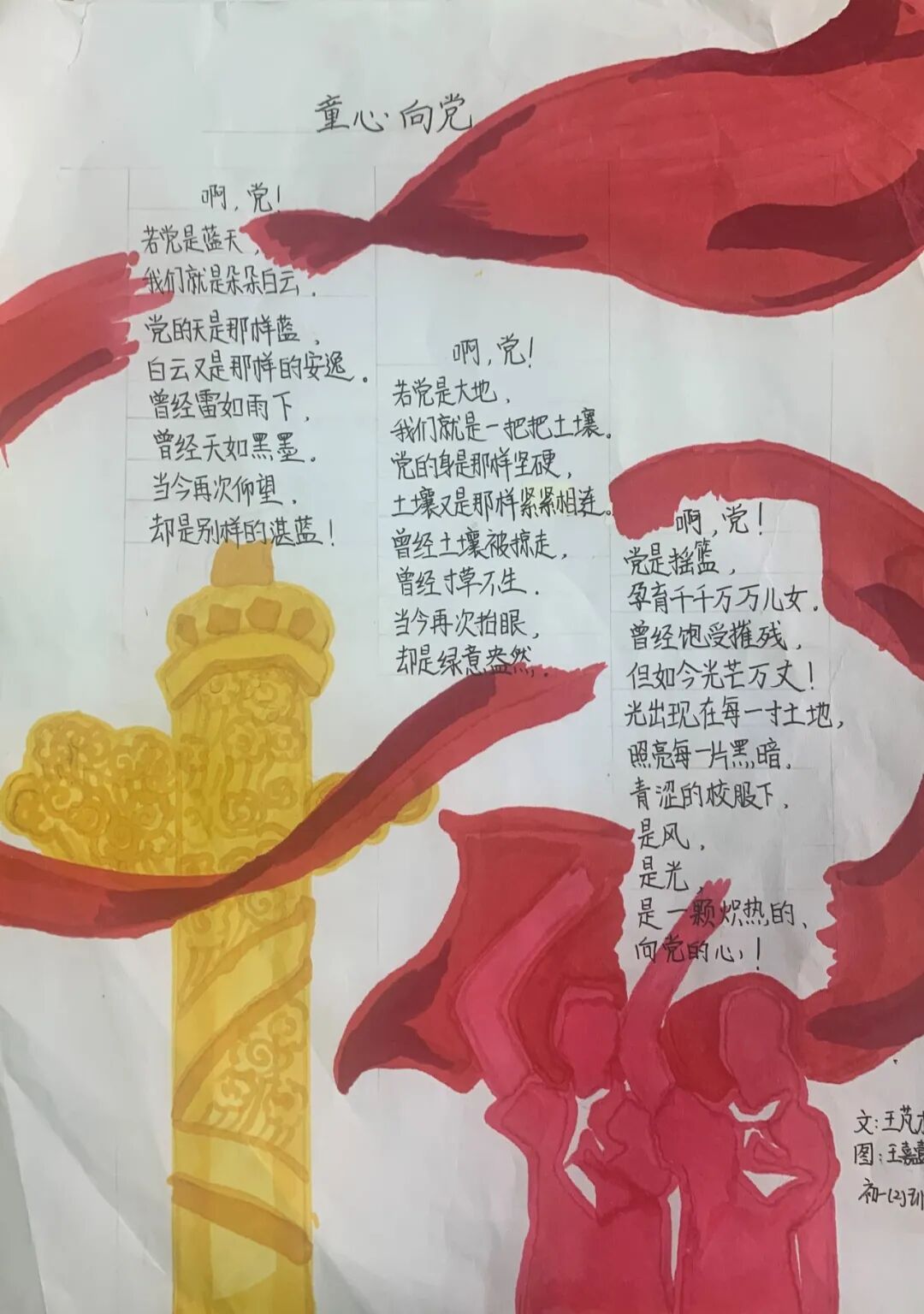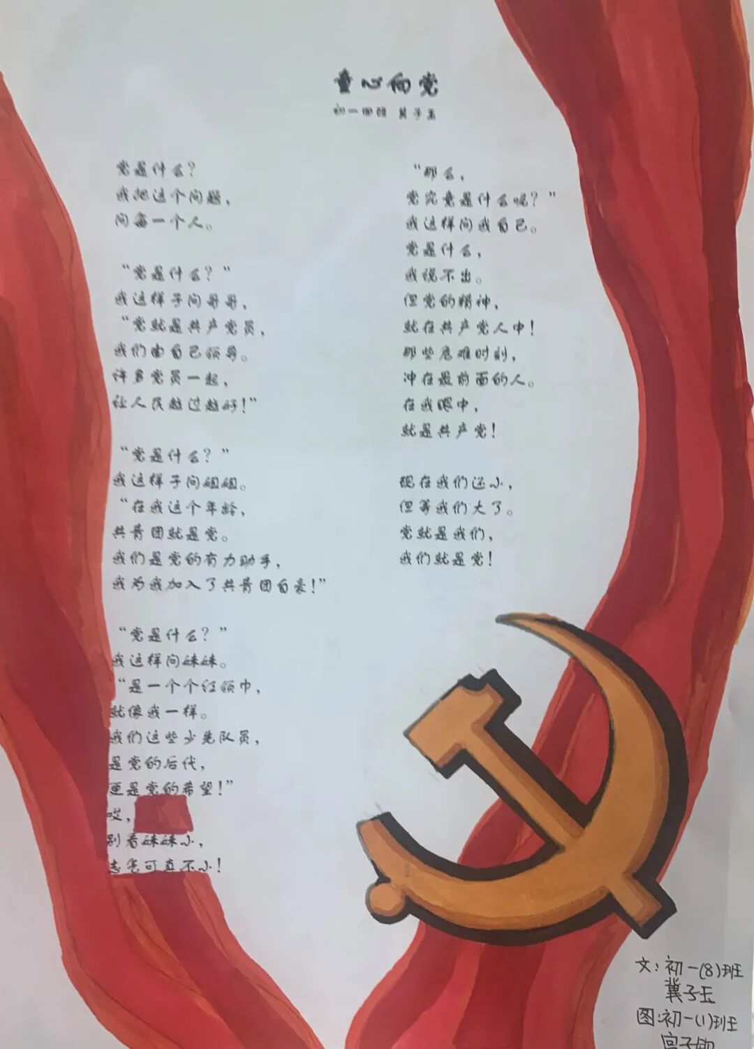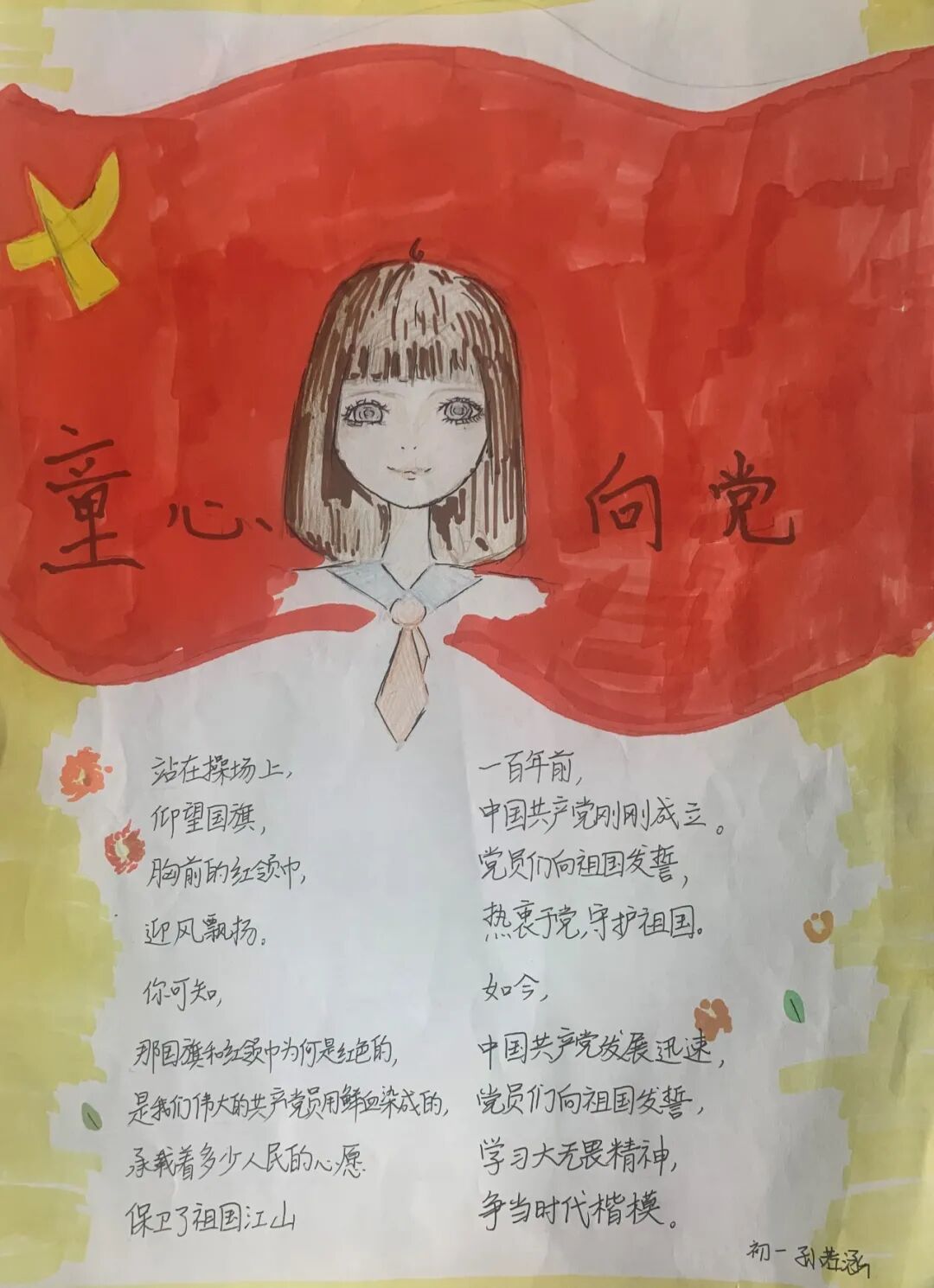 为了庆祝中国共产党成立100周年,北航实验学校中学部初一语文备课组与美术备课组合作,组织学生完成了“童心向党”的诗歌绘画创作与展示活动。