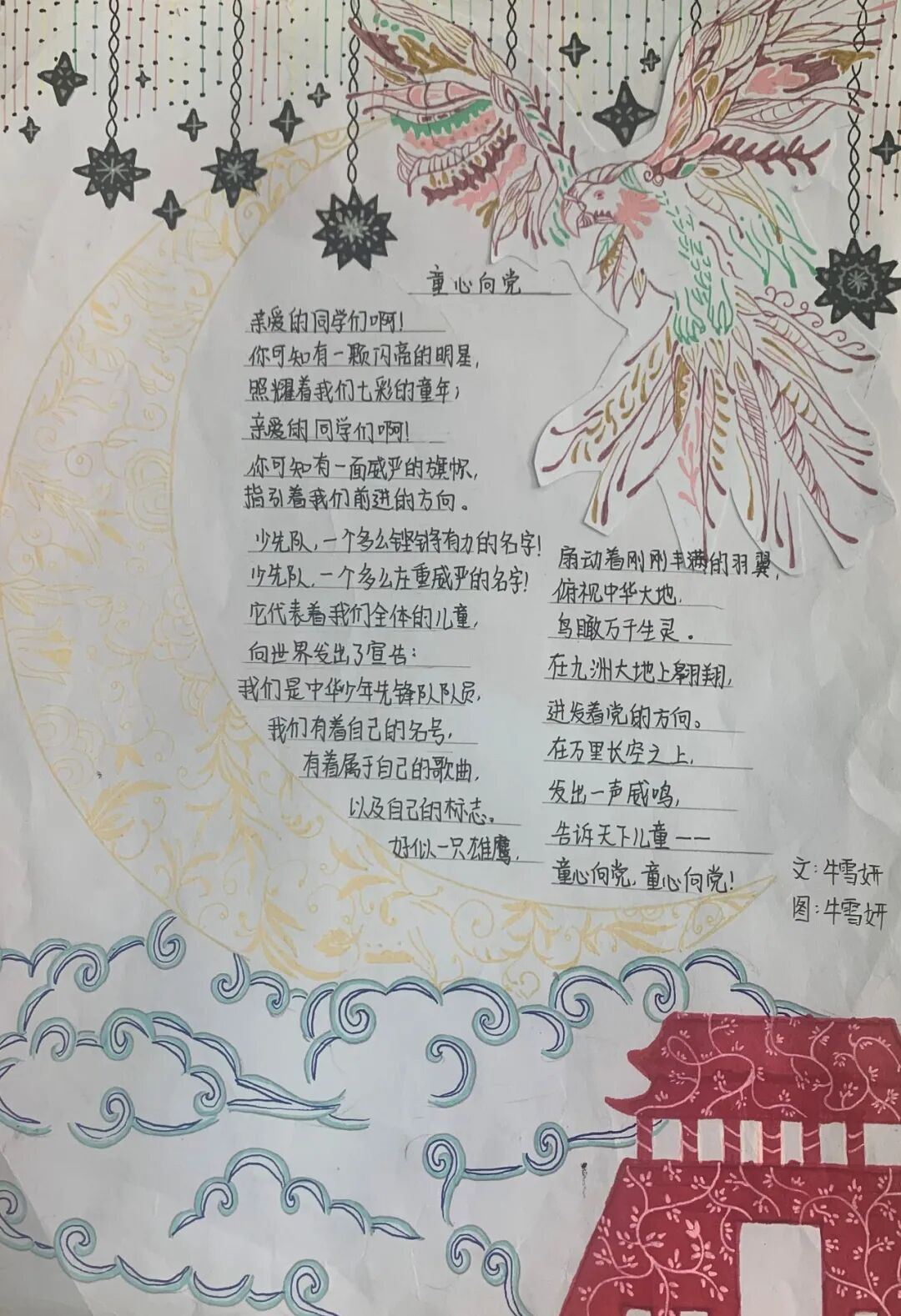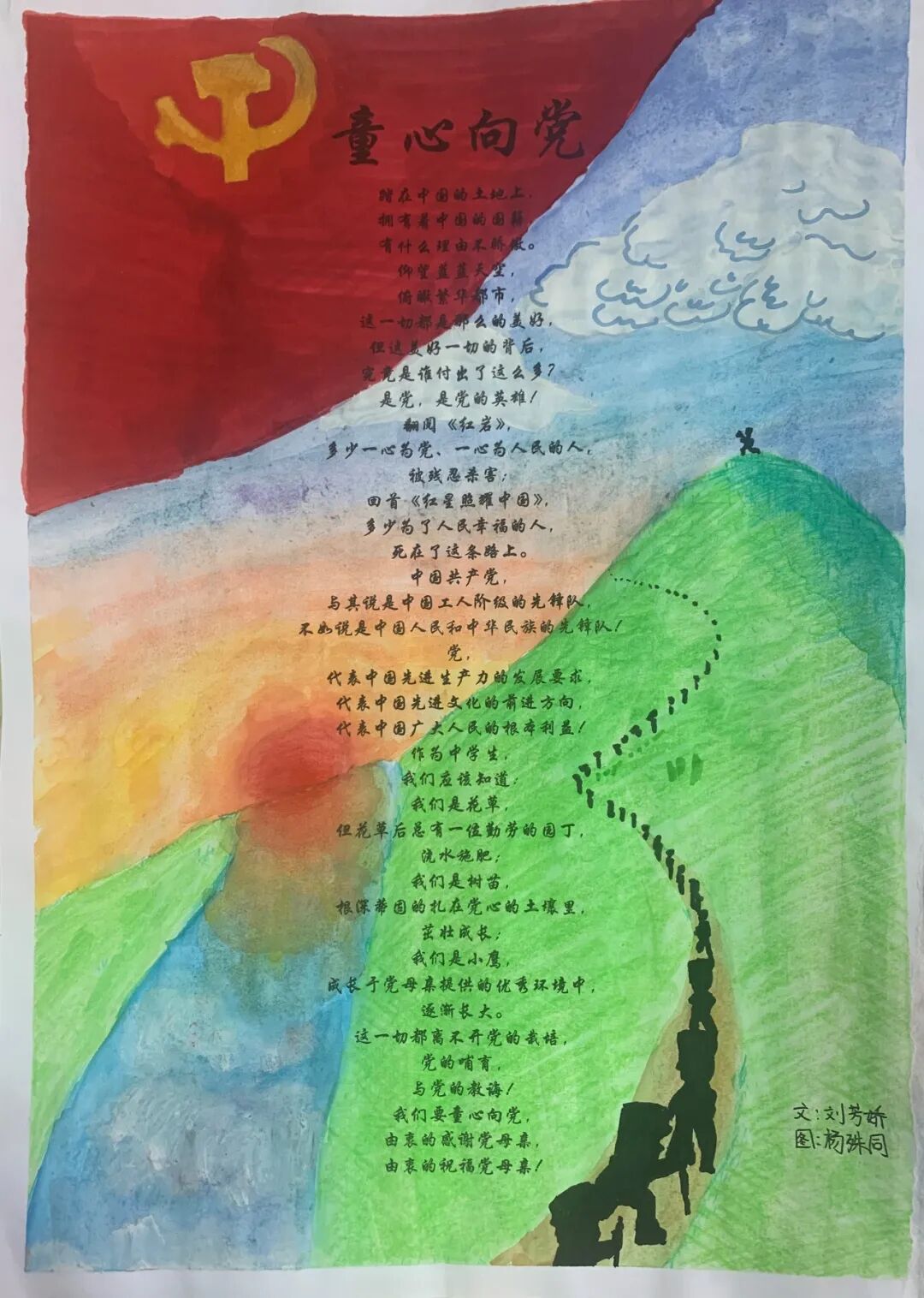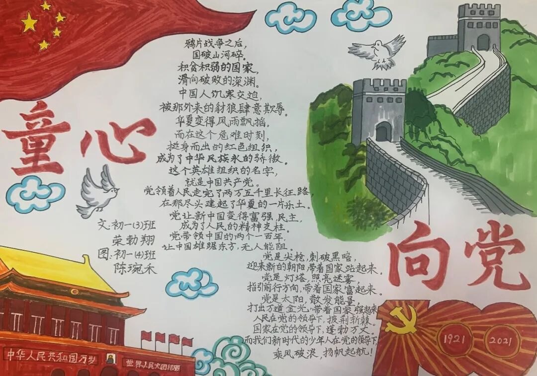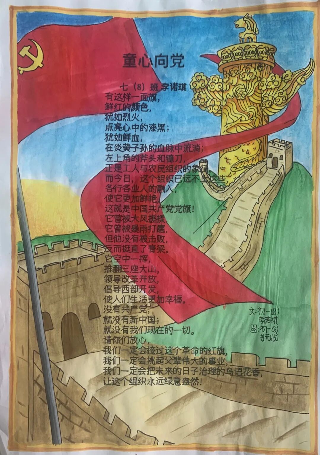 为了庆祝中国共产党成立100周年,北航实验学校中学部初一语文备课组与美术备课组合作,组织学生完成了“童心向党”的诗歌绘画创作与展示活动。