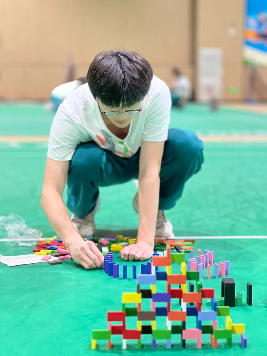 ▲多米诺骨牌比赛:“烽火长歌·骨牌史诗”高一学子以万枚骨牌构筑历史长卷