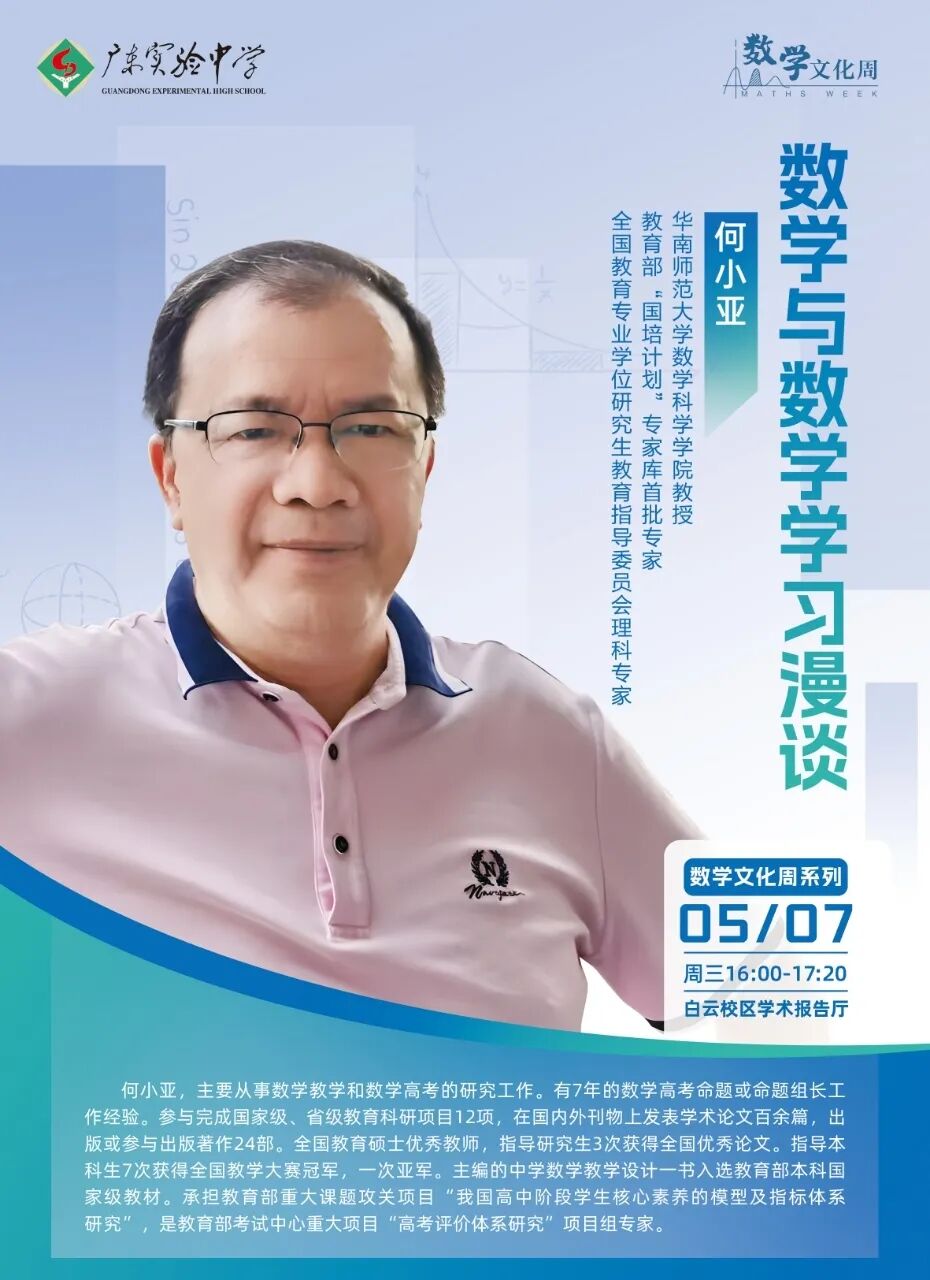 作为广东省首批数学教育高质量发展示范校,我校数学科秉承高质量发展理念,积极探索、研究、落实数学教育高质量发展方向以及重点落实举措。为弘扬数学文化,激发学生学习数学的兴趣,提升学生数学学科素养,广东实验中学四校区、三学部的数学教研组联动,举行了首届“数学文化周”系列活动。本次活动以“数学启迪智慧,文化润泽心灵”为主题,通过理论与实践相结合的活动形式,让学生在参与中感受数学魅力,让数学从抽象符号走向多维体验。