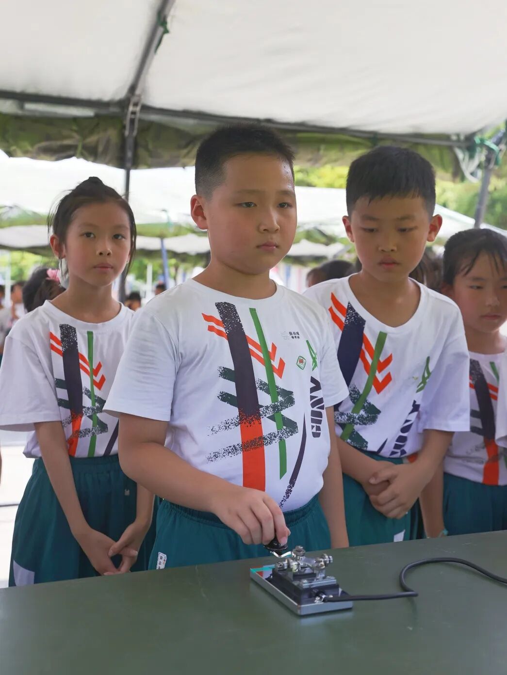 在通信专业的展示环节中,云仔云妮们跟随讲解员进一步了解军营使用的数字0-9对应的摩斯密码和发音,并尝试使用所学的摩斯密码发送信息以及破解一系列的摩斯密码。
