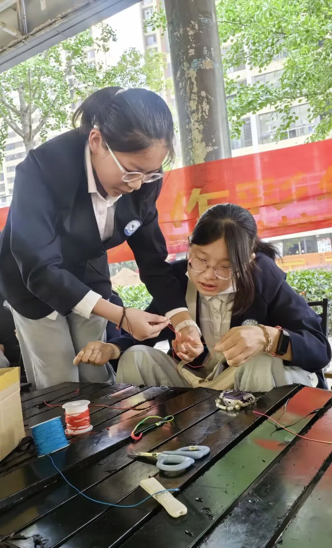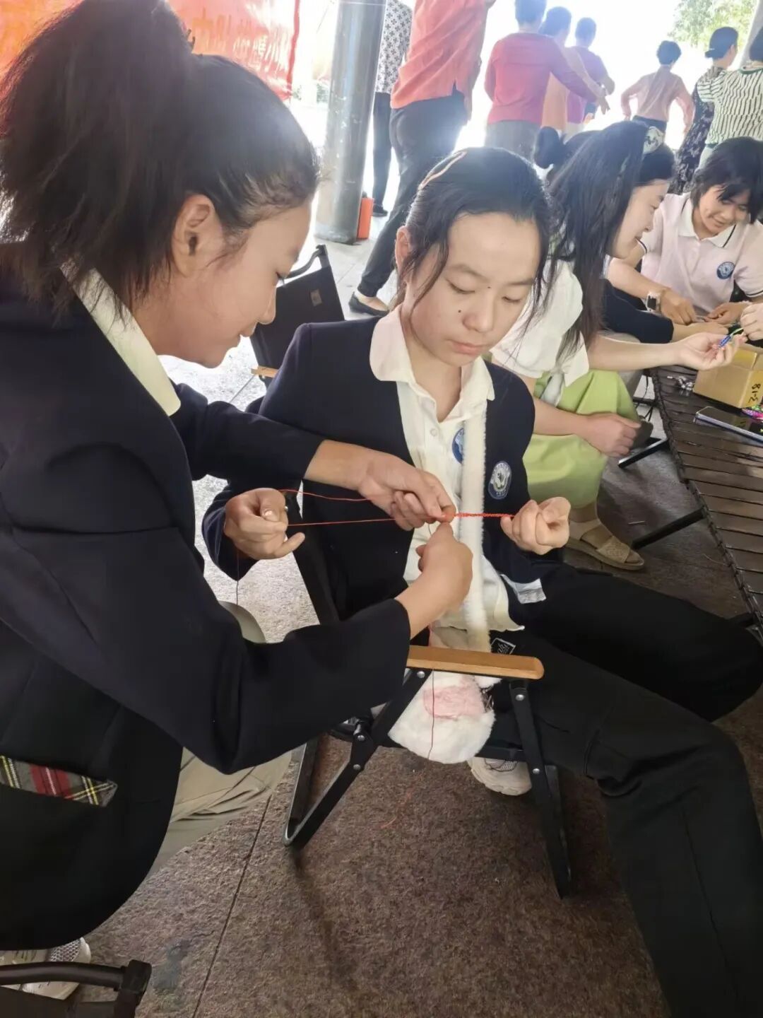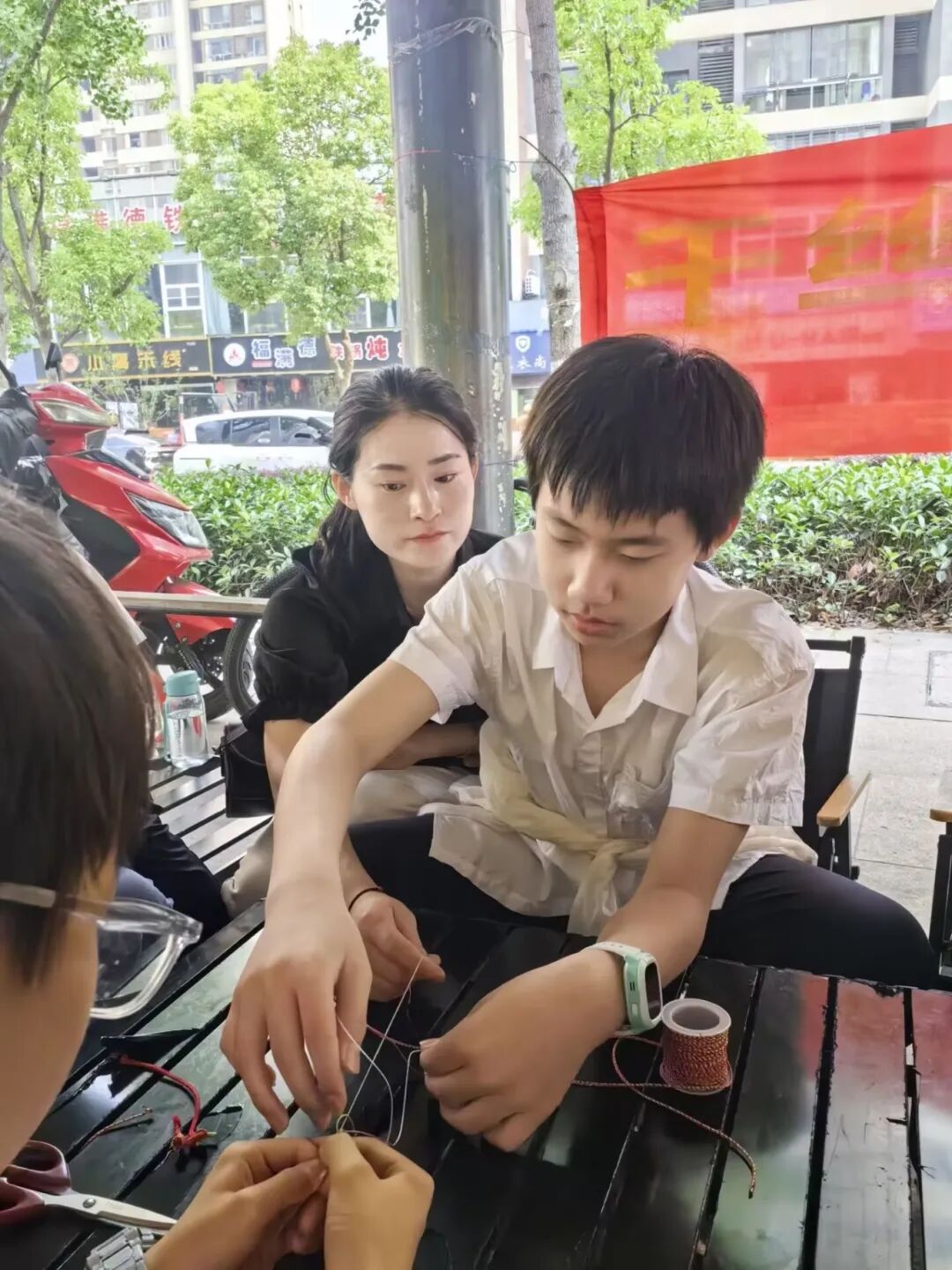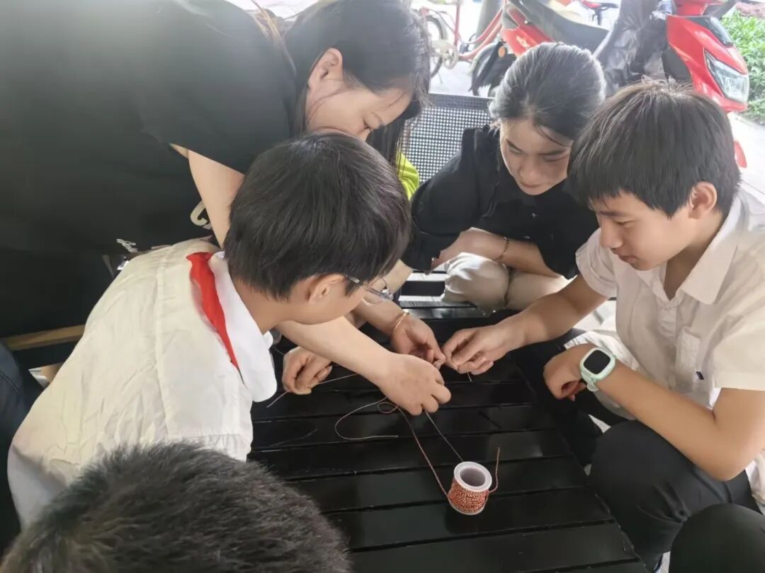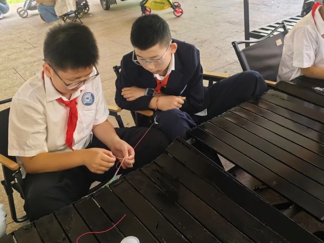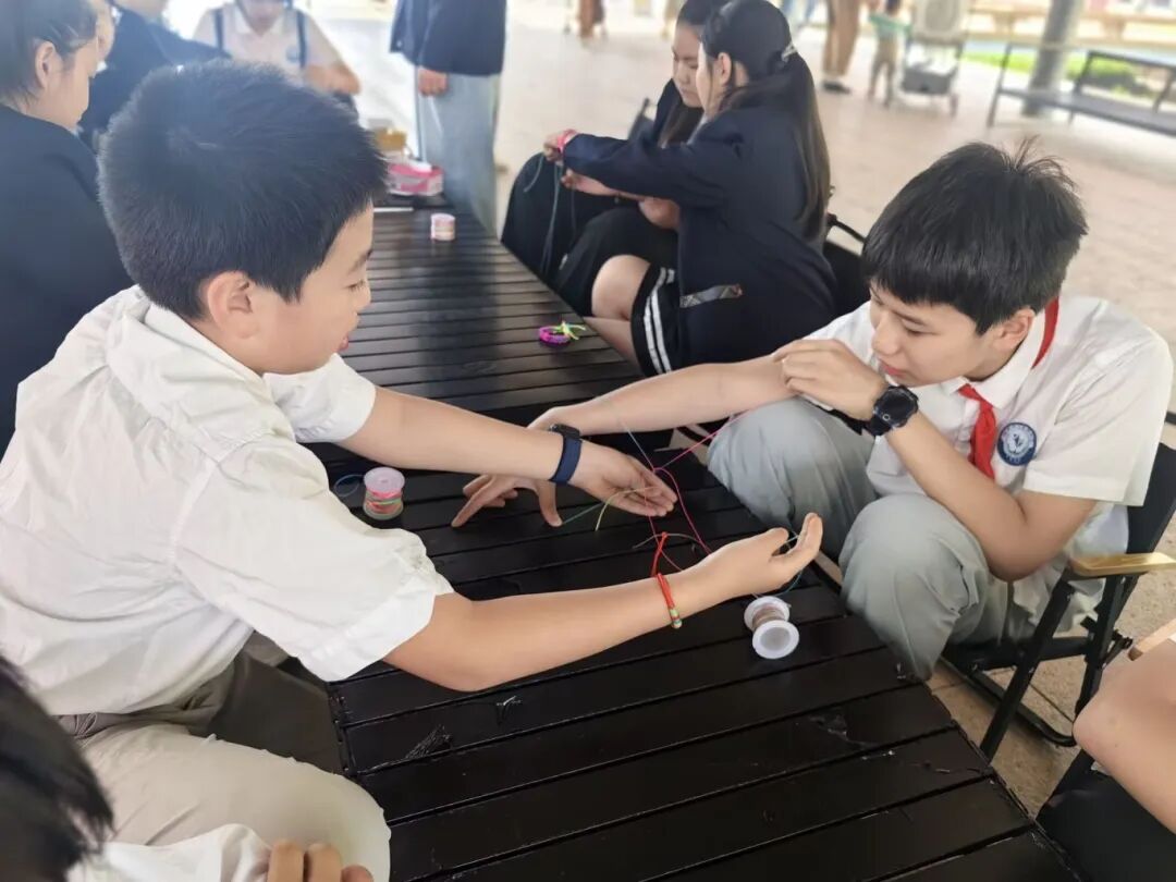 首先,同学们怀着热情与期待跟着江梦然妈妈学习五彩绳的编法,他们全神贯注地学习编织技巧,现场气氛热烈,吸引了市民朋友们的驻足观看。