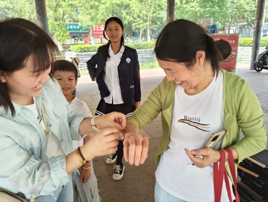 编织完成后,同学们脸上洋溢着自豪的笑容,他们迫不及待地走向周边的市民,将这些承载着自己心意的手工艺品送上,同时献上最真诚的端午祝福。市民们接过这份来自孩子们的温暖心意,脸上都露出了惊喜的笑容,纷纷点赞并回以美好的祝愿,现场充满了温馨与欢乐。