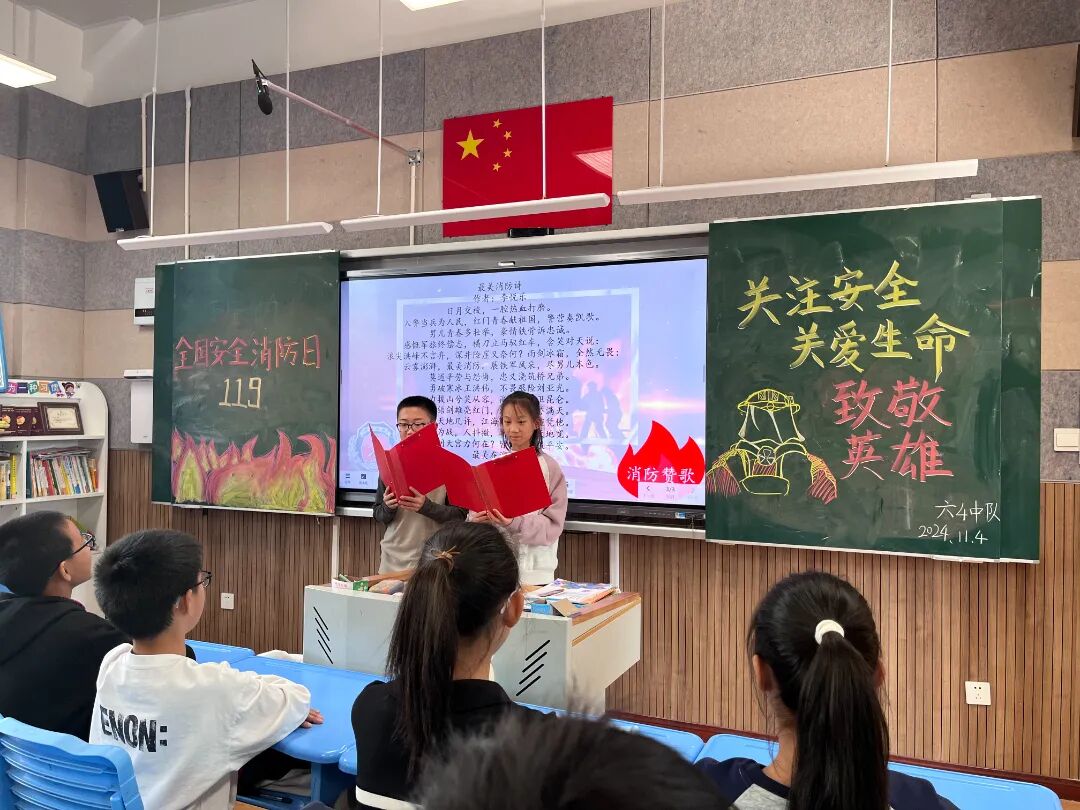 六(4)中队通过播放惊心动魄的火灾视频,让学生深刻认识到火灾的无情和危害。在致敬英雄环节,老师讲述了消防英雄们在火灾现场的英勇事迹。王乐佳同学和张锐轩同学还合作朗诵消防赞歌《最美消防诗》,赞美了消防官兵们的英雄精神。