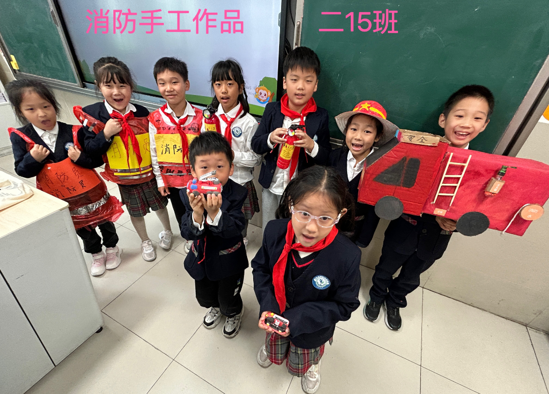 二(15)中队通过火灾的危害、预防措施、火场逃生技巧知识的讲解与队员们制作消防安全主题的消防服、灭火器、消防车等相结合,以及唱消防歌曲,表演消防手势舞等方式,提升了队员们的消防安全意识。