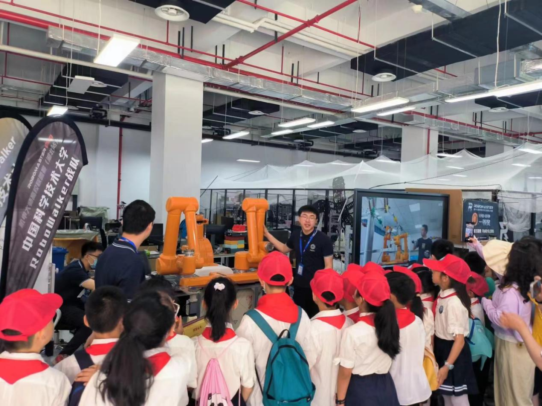 “工程科普点”是启航中队此次探索的第一站。通过工程学院仿生机器人实验室相关人员的介绍,队员们认识了“仿生机器鱼”,了解到生物推进的特性;现场观看并体验了“双足机器人”“仿生足式机器人”在平地、坡地、障碍以及冲击下的行动特征以及人工肌肉特征;了解到“人形机器人合作”在医学、科技、汽车等方面的应用。活灵活现、栩栩如生的机器人激起了队员们探索科学的好奇心,他们兴致勃勃,纷纷开启“提问模式”,对于自己好奇的事情刨根问底,一探究竟。